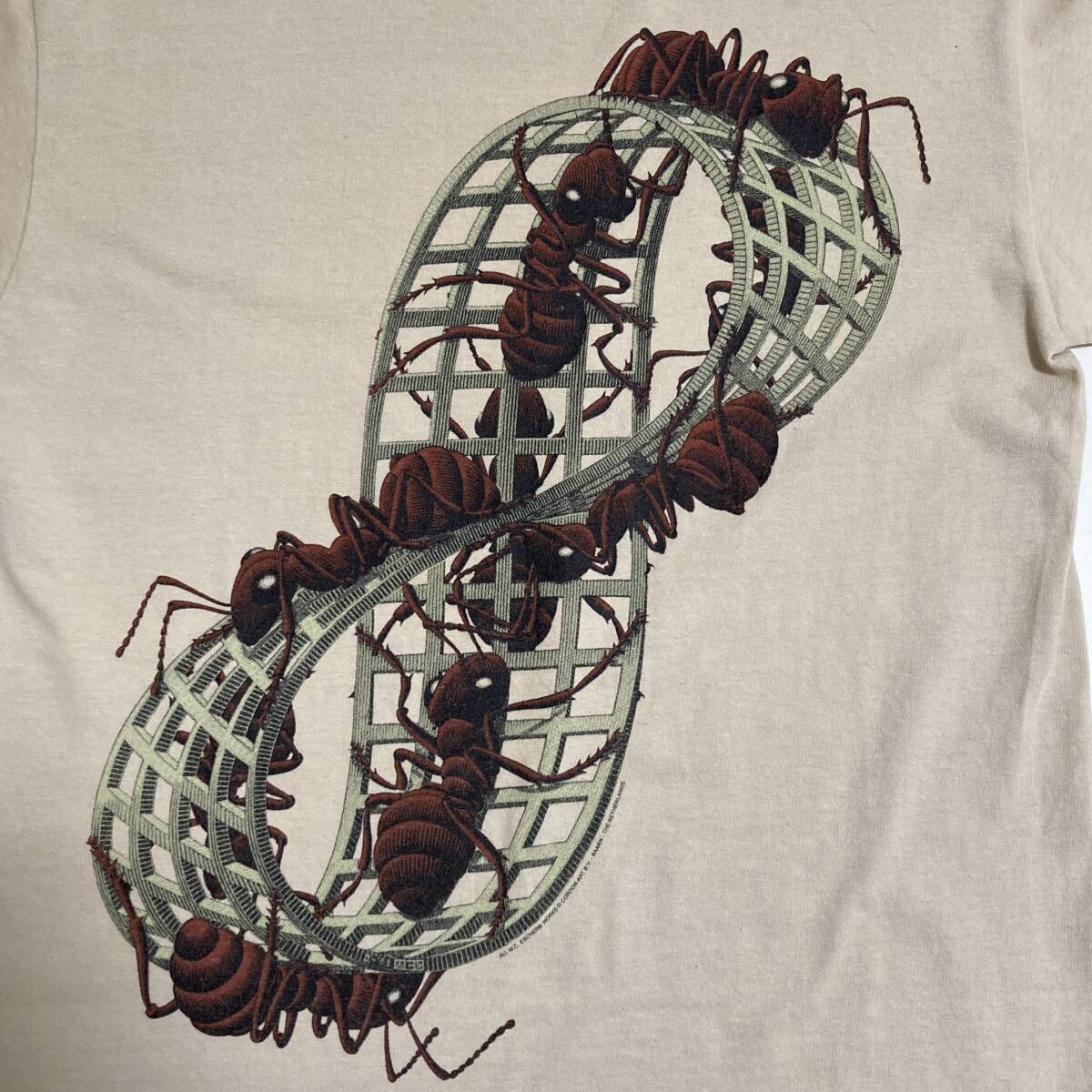レア カラー 00s M.C. Escher 蟻 騙し絵 Tシャツ ベージュ Sサイズ エッシャー アート Tee VINTAGE ビンテージ オールド 1484