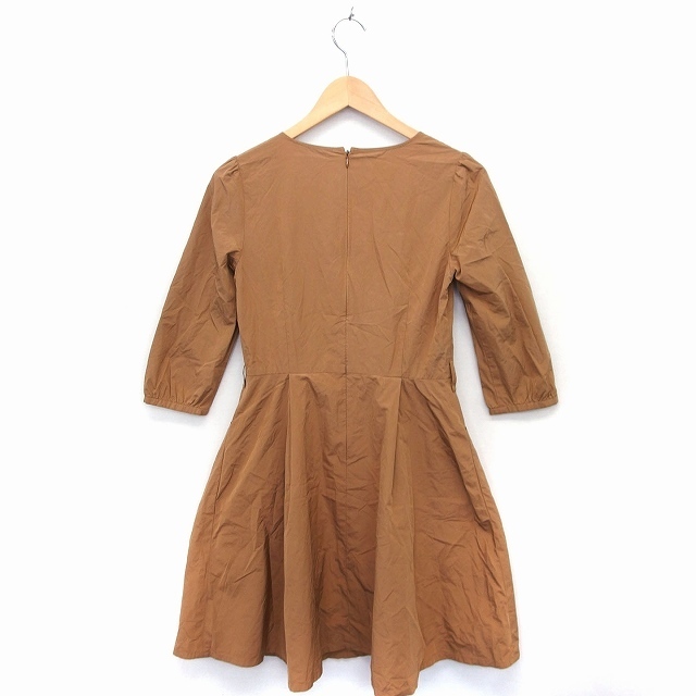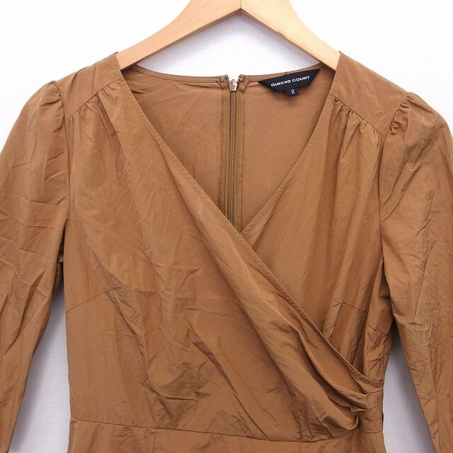 クイーンズコート QUEENS COURT フレア ワンピース カシュクール ロング 七分袖 無地 2 キャメル 茶 /FT35 レディース