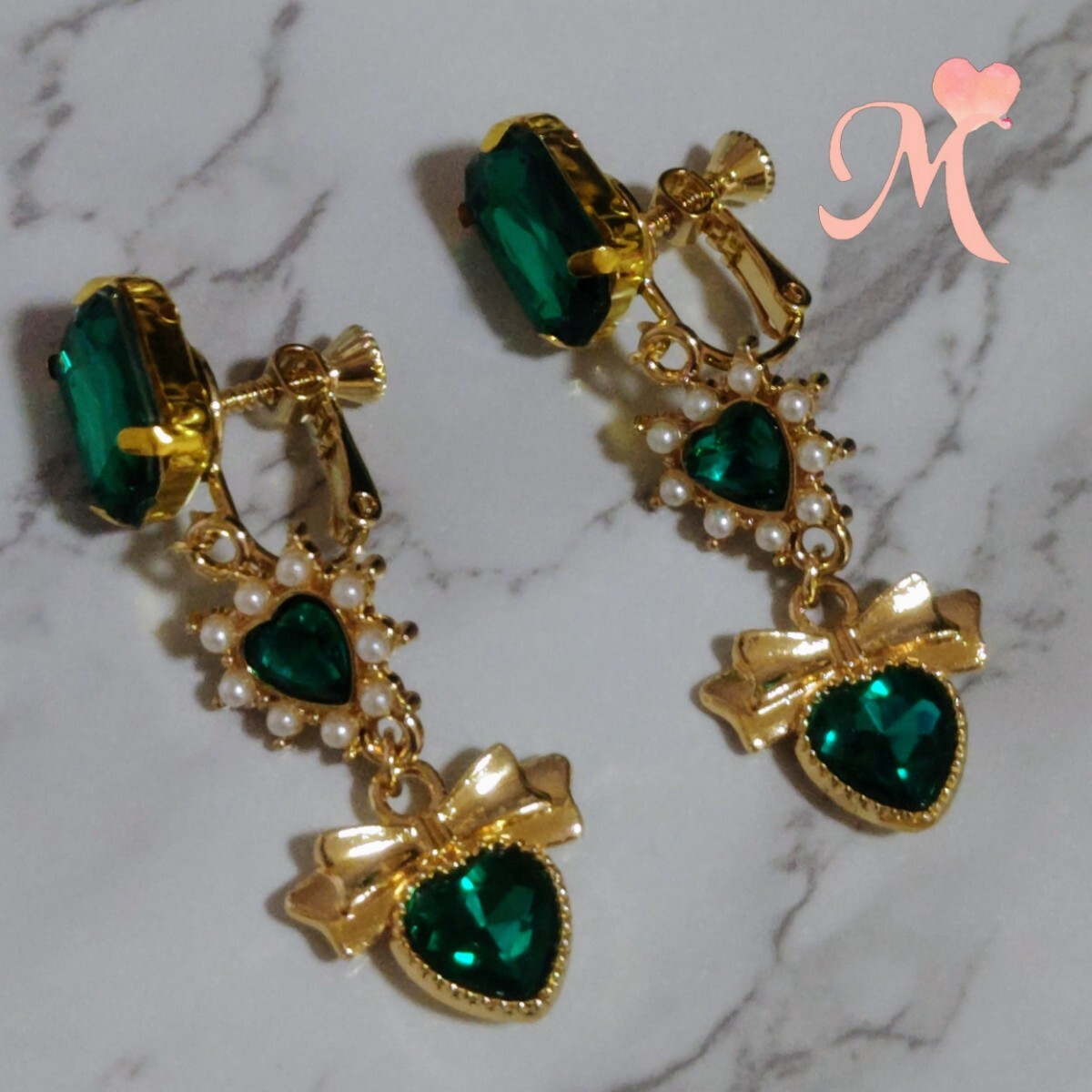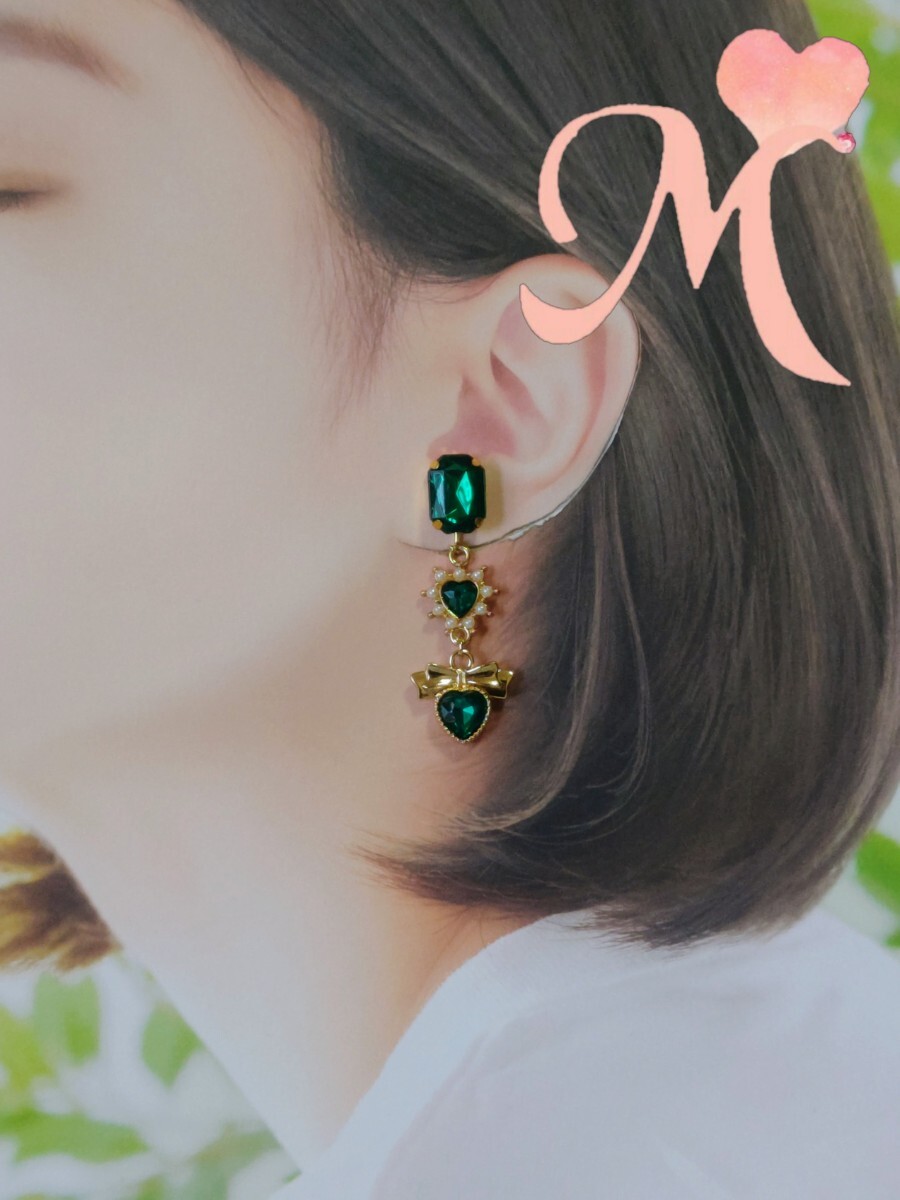 ハンドメイド 金属アレルギー対応 イヤリング or ピアス ガラス ストーン ハート リボン ドレス にも