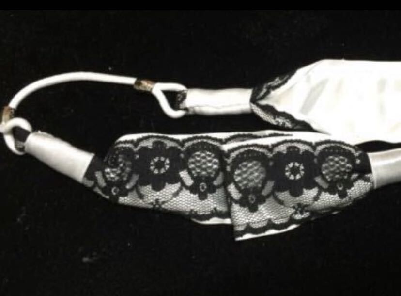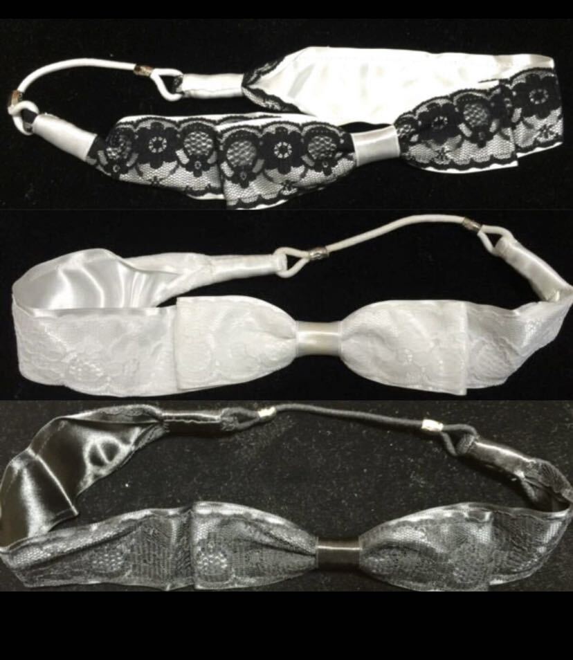 レースとサテンリボンを二重にしたヘアーバンドで、一部ゴムになっているので、簡単につけられます。黒と白と黒白のセットです。新品ですが自宅保管ですのでその点ご理解頂ける方よろしくお願いします。