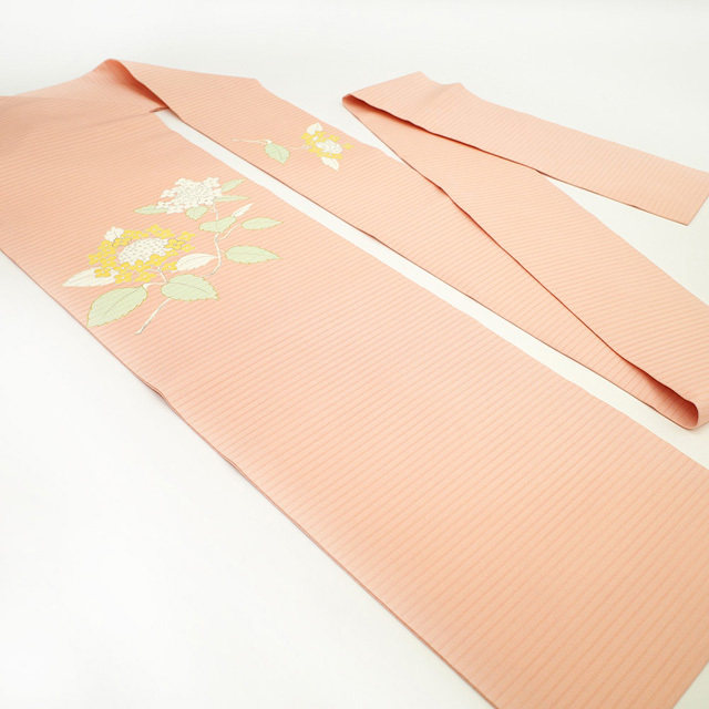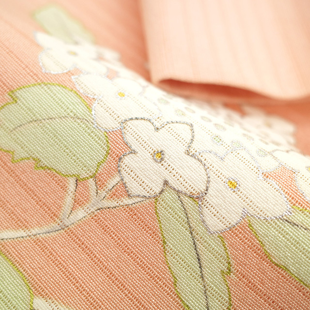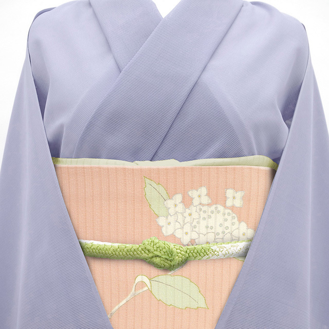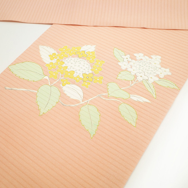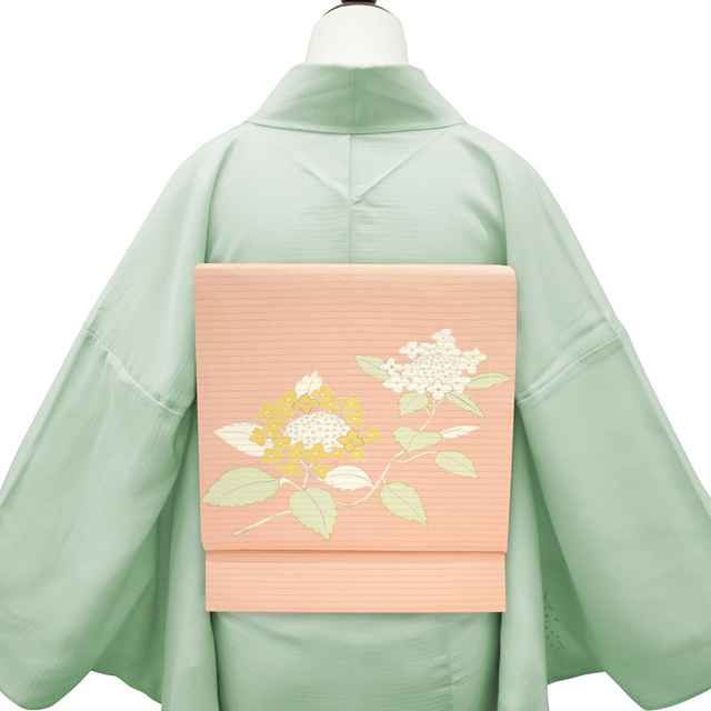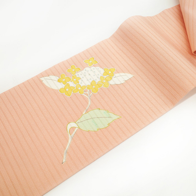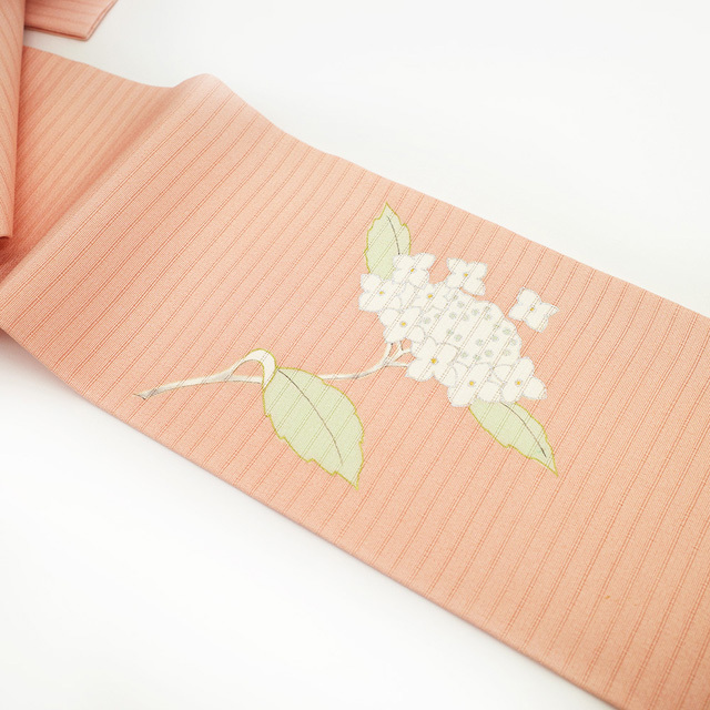 こちらの帯は 紫陽花 がデザインされておりますので、6月頃 単衣 着物 に合わせて頂くと素敵かと思います。