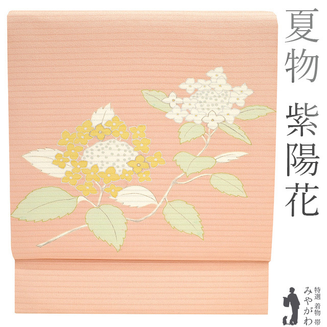 夏物 名古屋帯 九寸 絽 染め帯 正絹 銀彩加工 手染め ピンクベージュ 紫陽花 アジサイ カジュアル 新古品 仕立て上がり みやがわ sb52551