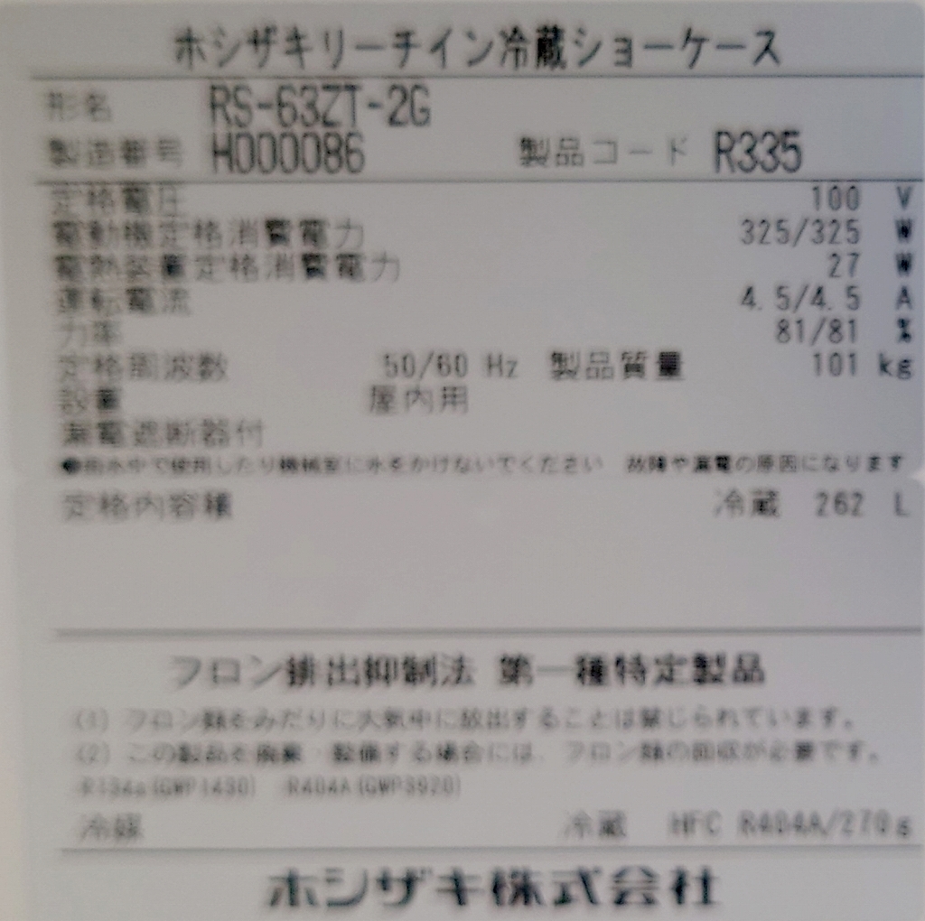 | 縦型2ドア冷蔵ショーケース 100v ホシザキ RS-63ZT-2G 086 | |