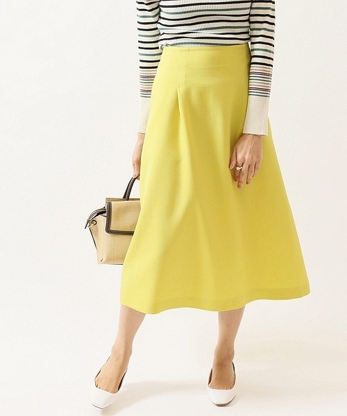 イエナ・トラペーズラインのミディアム丈スカート。フロントのタックはステッチワークがポイントの拘りの一枚。ボンディング加工を施した生地はハリ感があり、綺麗なシルエットを演出します。リネンライクな表面感のトリアセテート素材は、シワになりにくいのも魅力。発色が抜群に美しく、スタイリングのアクセントに重宝します。