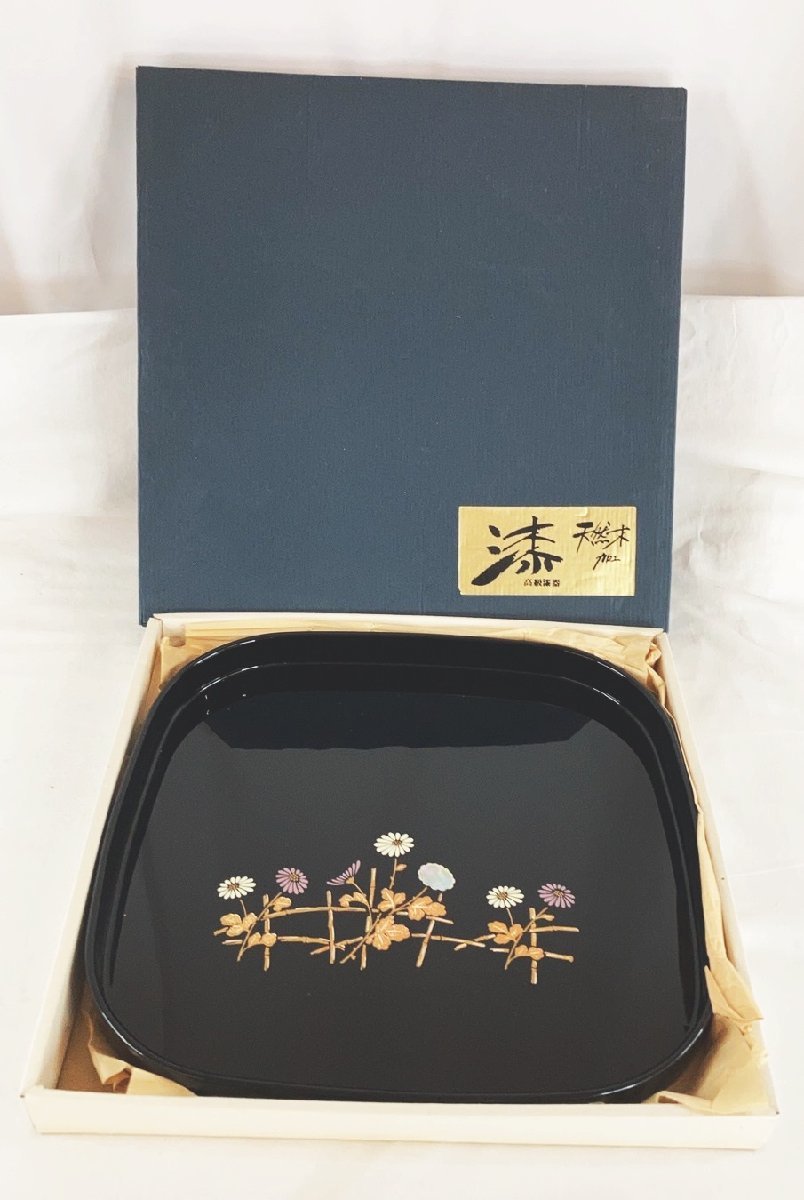 中古 ナショナル 垣根菊 漆器 お盆 トレイ 角盆 天然木加工 共箱付 KO-1 20230919