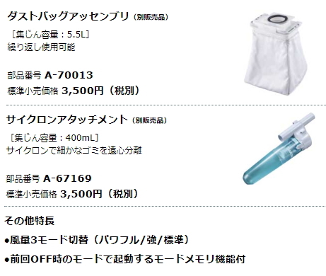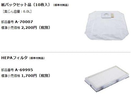 [集じん容量:6.0L]部品番号 A-70007 標準小売価格 2,200円(税別)