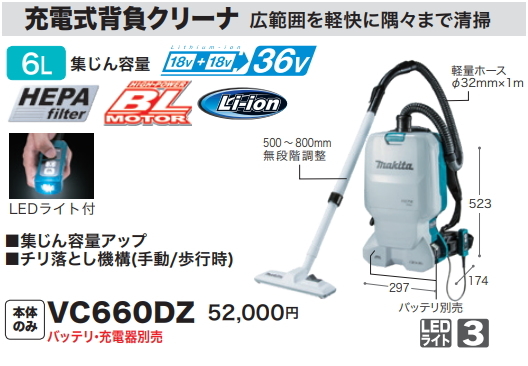 マキタ 充電式背負クリーナ VC660DZ 【18Vx2本→36V】