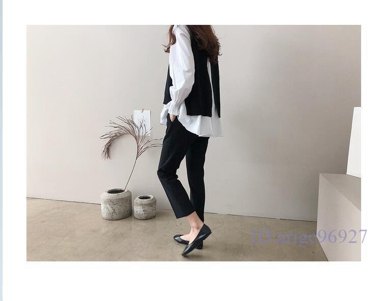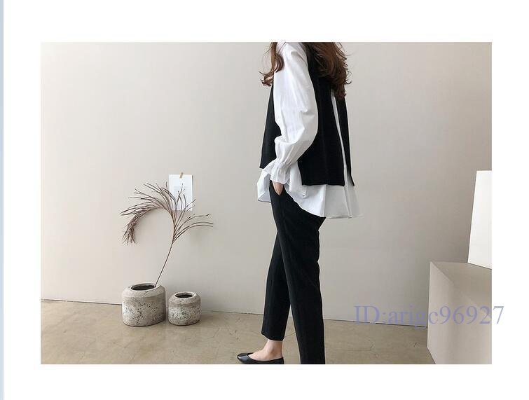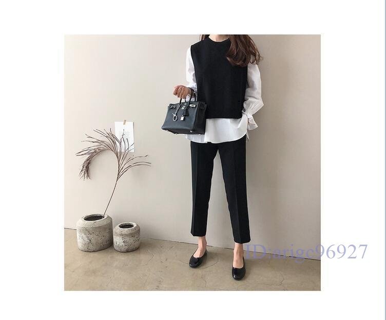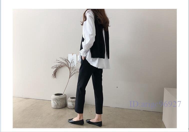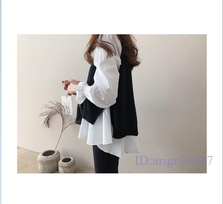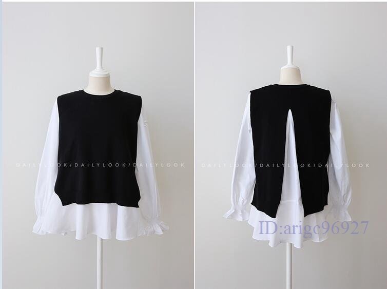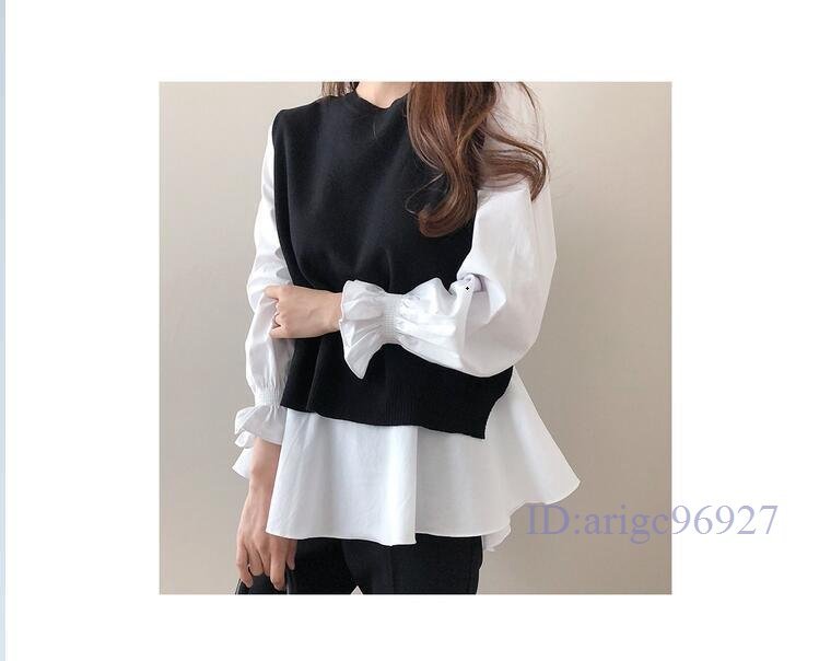 Q657☆新品秋 ナチュラル 可愛い ゆったりレディース ボーダー柄ブラウス+ニットベスト長袖 2点セット 黒白 選択/Mサイズ
