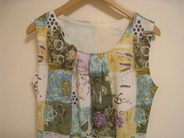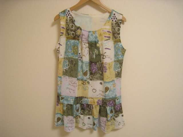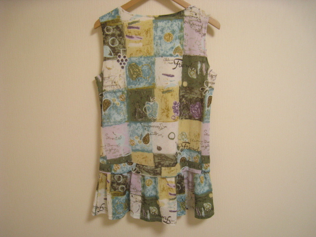 205 zero チュニック 袖なし ノースリーブ 裾フリル 総柄 果物 くだもの フルーツ 白×緑×青 ホワイト×グリーン×ブルー