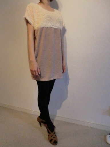 【KCM】yng-48-M★新品未使用★【Ailes】フレンチスリーブ 半袖 チュニック 切替 M ベージュ レディース