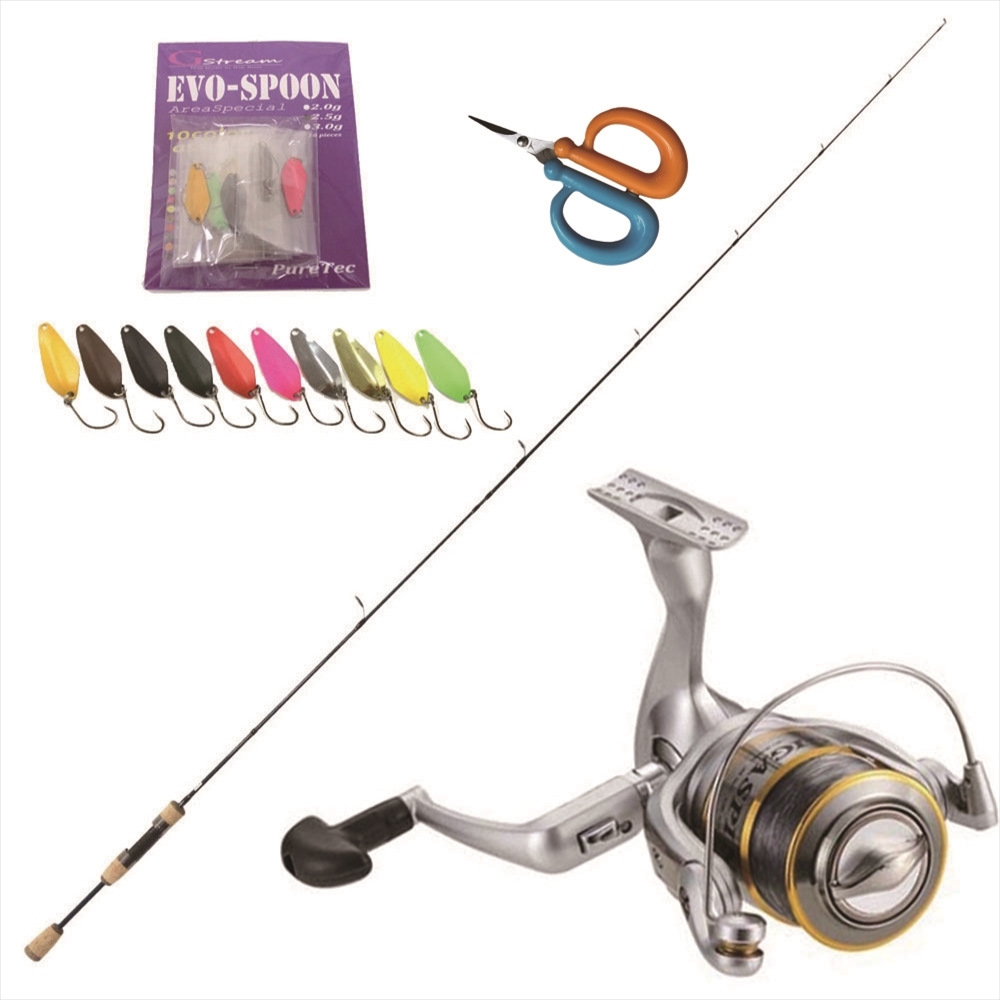 ロッド&リールにスプーン10個と、落としても水に沈まないハサミが入ったエリアトラウト初心者入門セットです