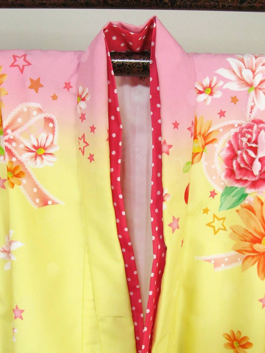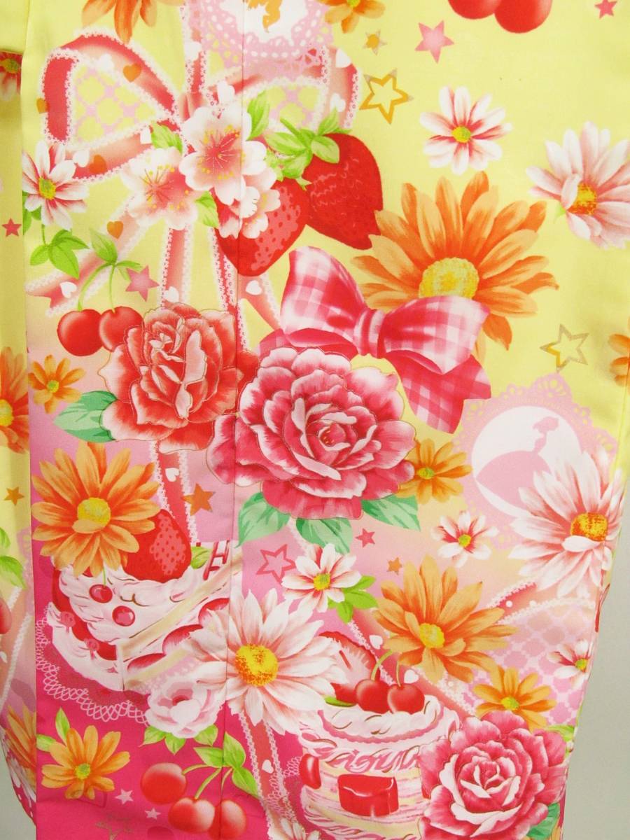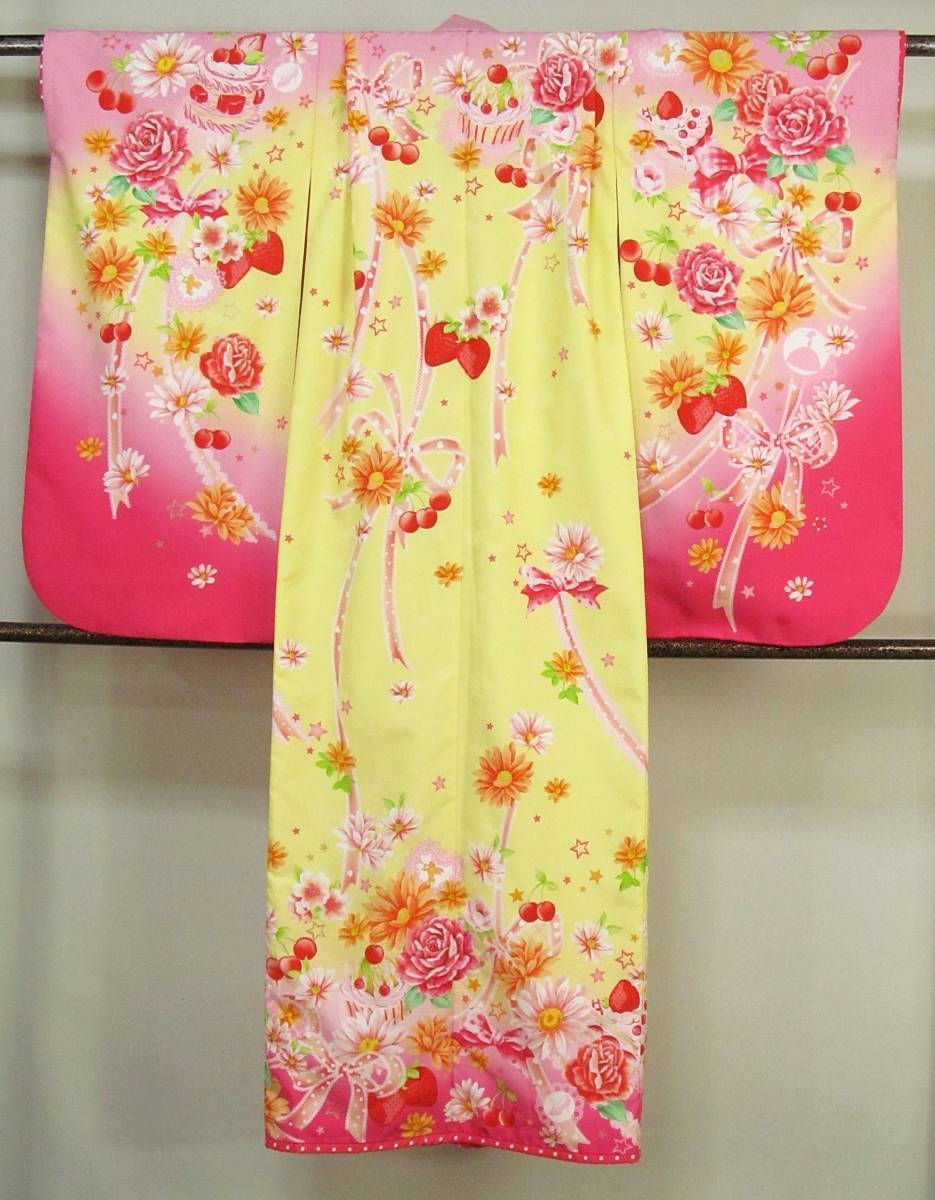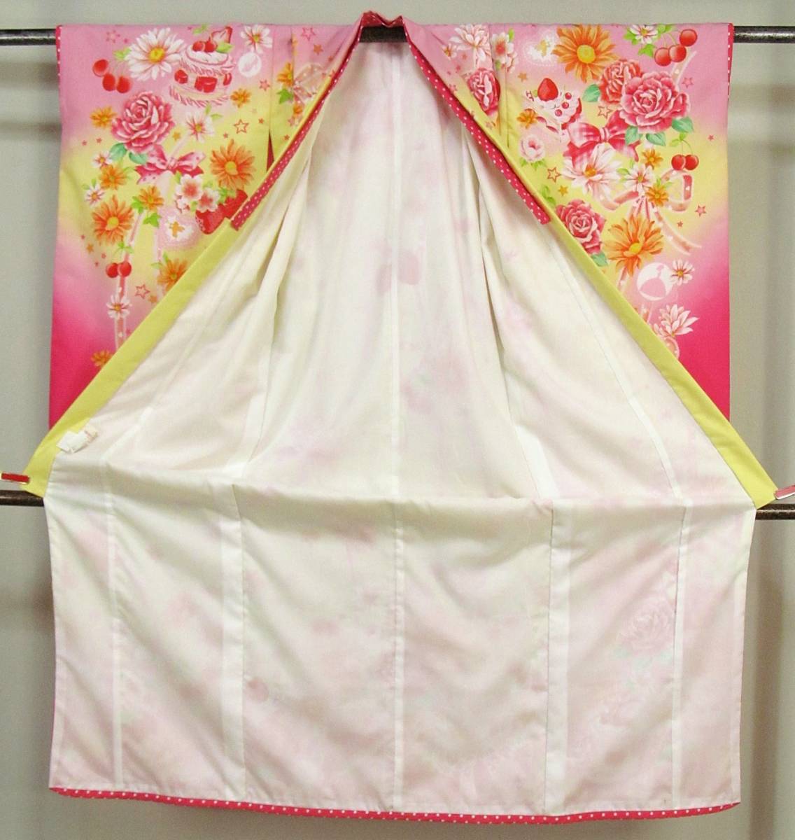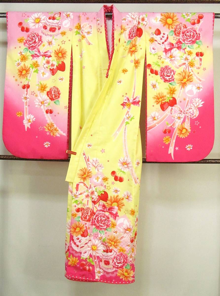 し14 化繊 7歳用 着物 SEIKO MATSUDA 薔薇 苺 サクランボ ケーキ 美品 身丈135cm 七五三 ◎◎セール◎◎