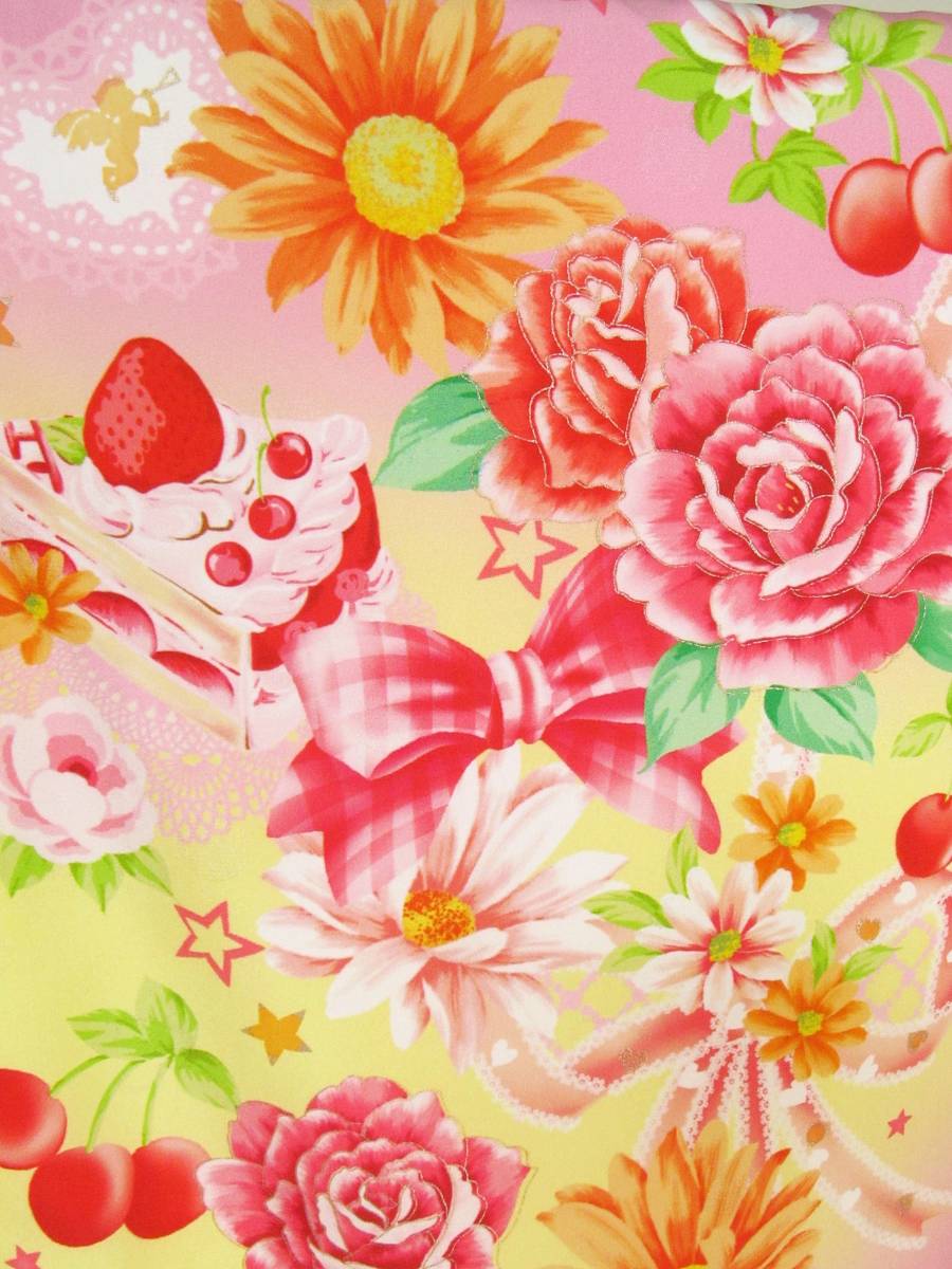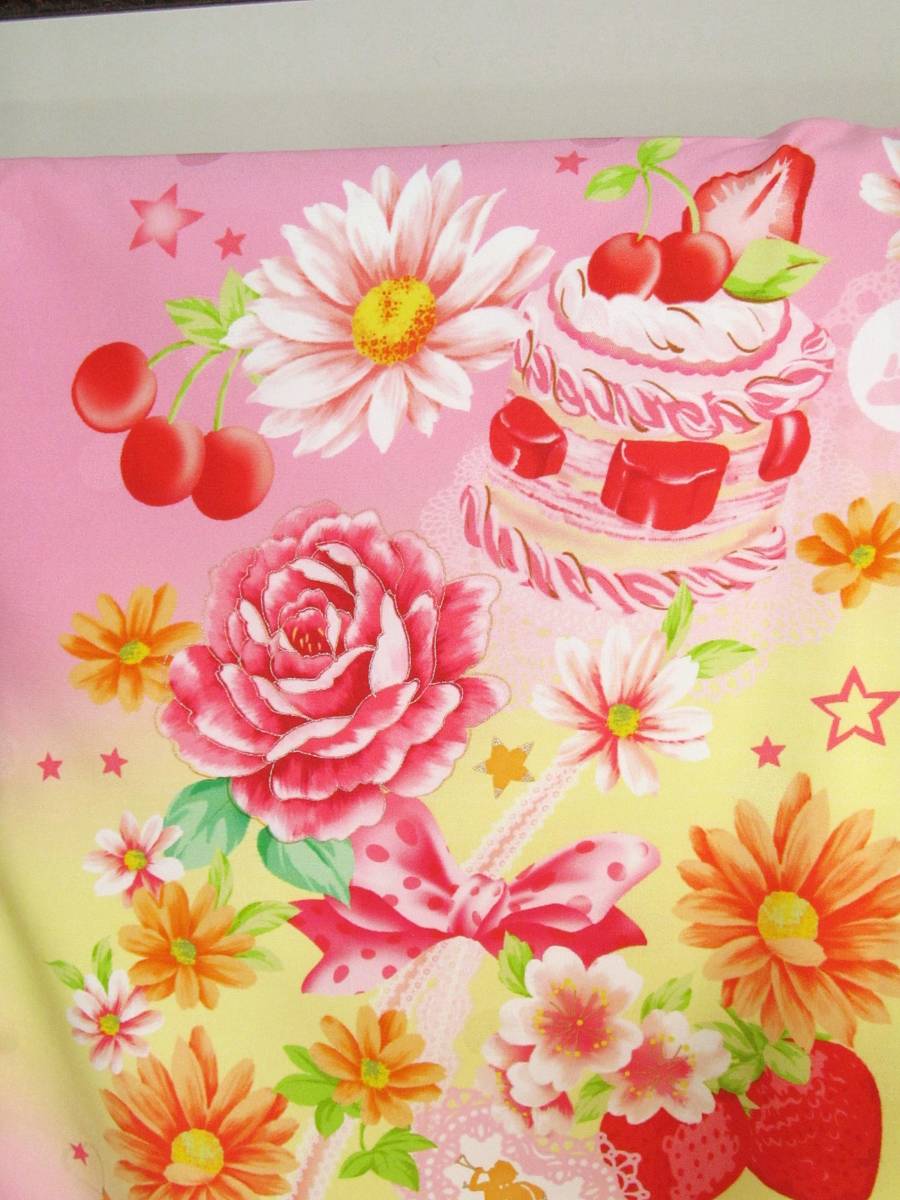 ぼかし色地にバラやイチゴやサクランボやケーキなどのとても可愛い柄です。