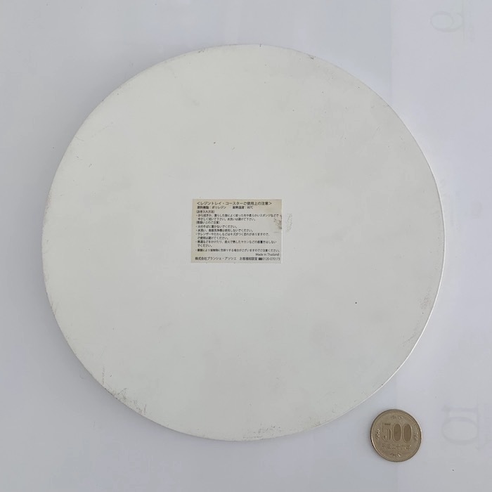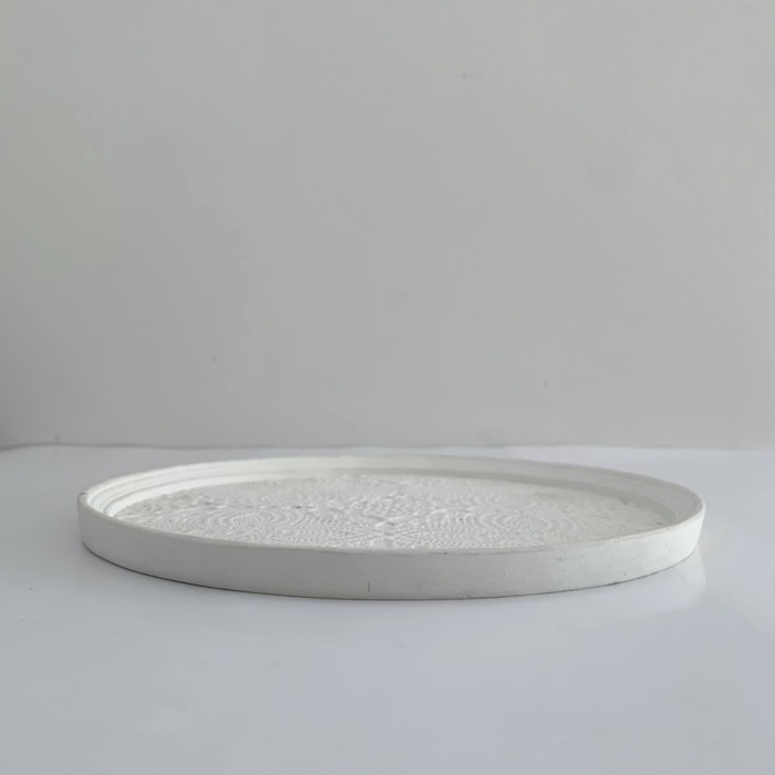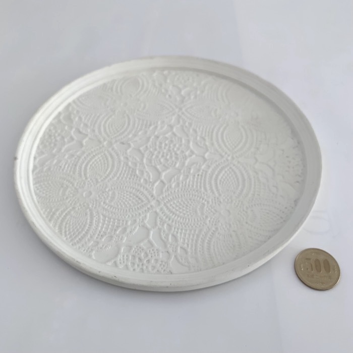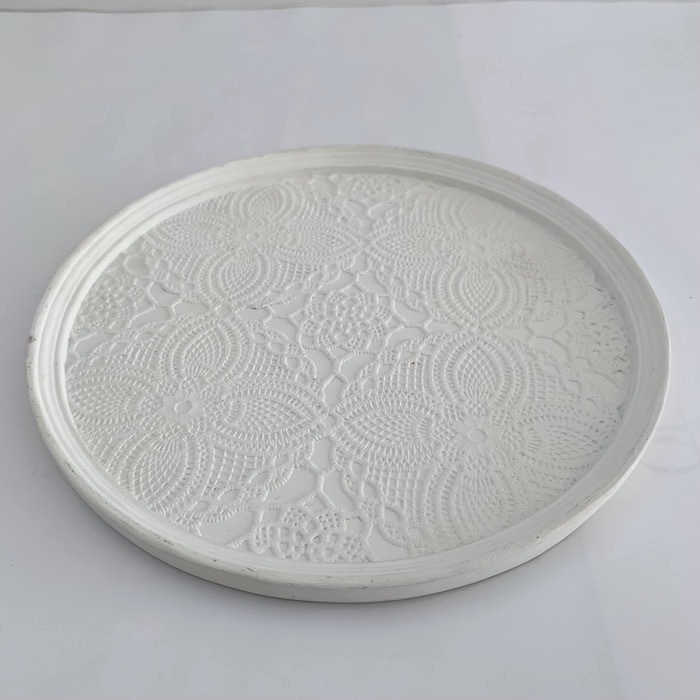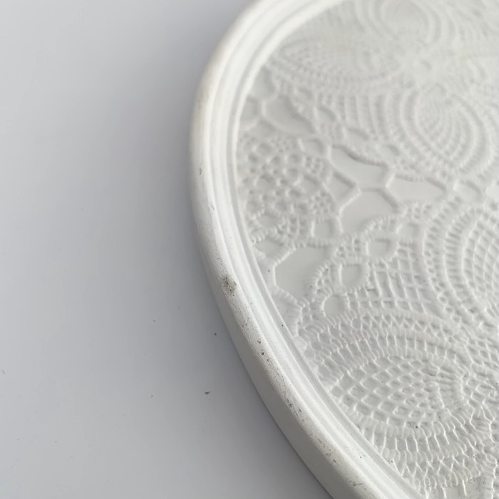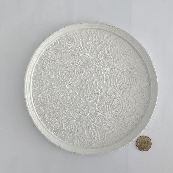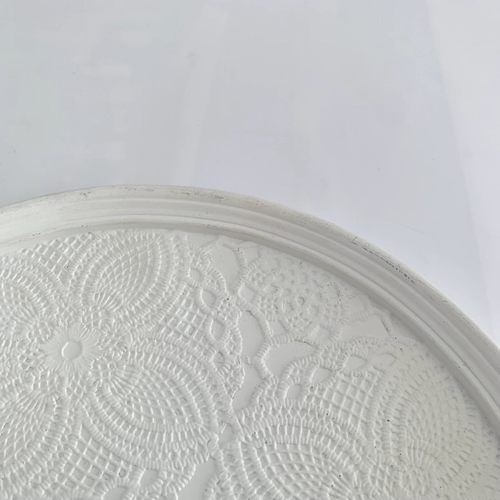 レース模様のラウンドトレイです。撮影用でしたので生活使用はありません。縁にやや汚れがあります。H1.3cm W21.8cmほどの大きさです。箱などはありません、本体のみです。