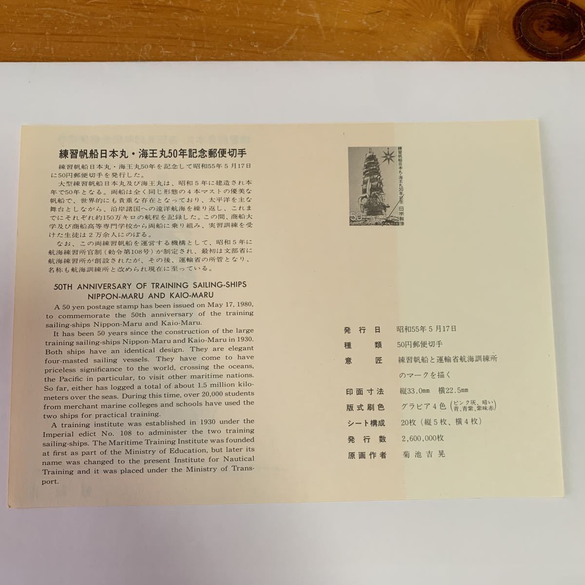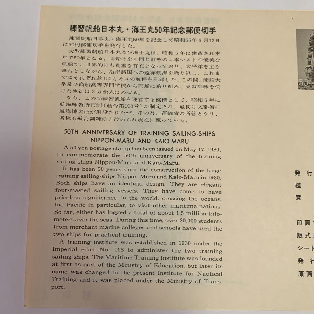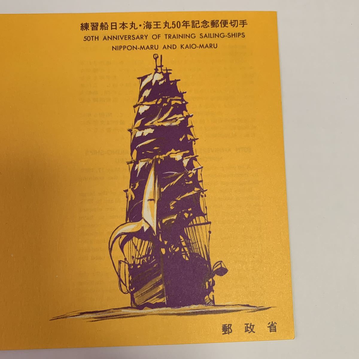 リーフレット 切手なし 1980年 郵政省 練習帆船日本丸・海王丸50年記念郵便切手 昭和55年5月17日 練習帆船と運輸省航海訓練所 のマークを描く レア 希少 非売品 美品 送料無料の出品です。 サイズ横21.1センチ縦15センチ 納戸の整理(断捨離)で今後使用予定が ない為出品しました。 衣装ケースに入れて保管してました。