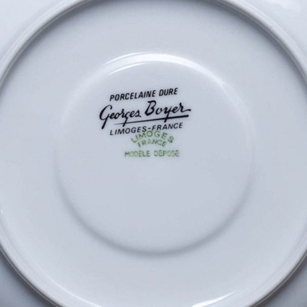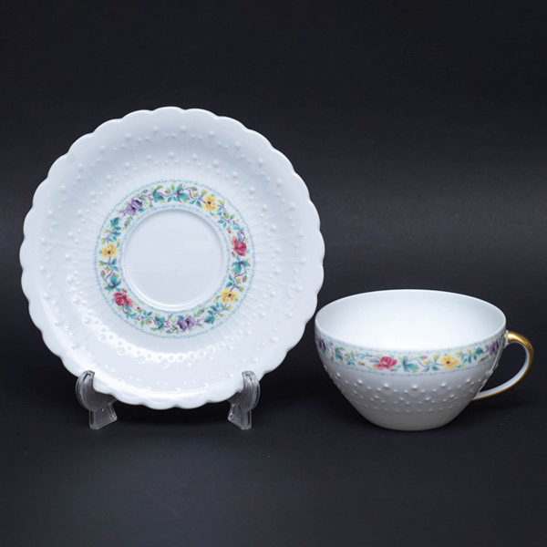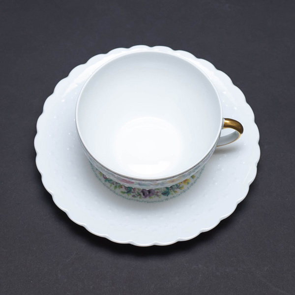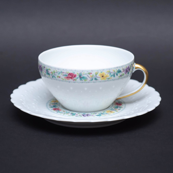 フランスのリモージュ地方の工房の一つ、ジョルジュ・ボワイエのペルサーンのティーカップ&ソーサー。 薄く焼かれた白磁に色とりどりの小花が描かれた上品なシリーズ。白磁自体にも草花をモチーフにした装飾が施されています。現在は廃盤になっています。英名の"Diademe Princess"は"ティアラ"という意味で、花冠からの命名ですかね。 ■サイズ カップ:直径97 × 高さ54mm、ソーサー:直径142mm ■付属品 なし ■状態 B(良品):特に目立つダメージのない、状態の良いお品物です。 |
