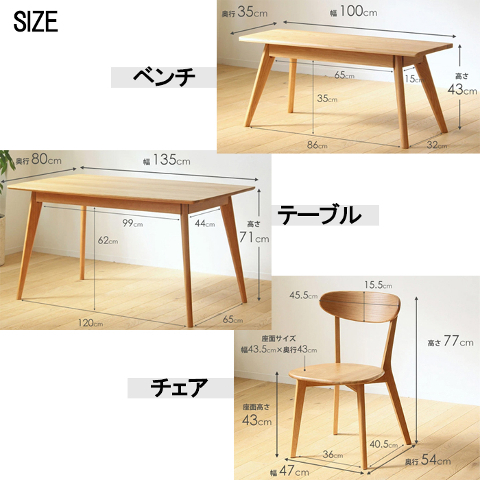 セット内容:ダイニングテーブル幅135cm×1台、ダイニングチェア×2脚、ダイニングベンチ×1脚