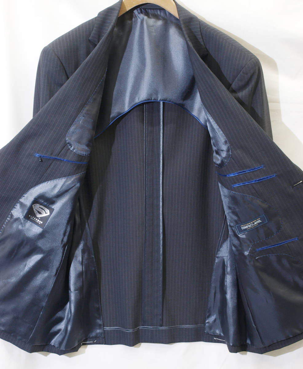 【サイズ】 A6号 (AL号サイズ相当) 目安の体型 身長170cm~180cm、ウエストサイズ82cm前後 【ジャケット実寸】 肩幅46.5cm 着丈73.5cm 袖丈62cm 脇下部分51cm 身幅46cm 【パンツ実寸】 ウエスト(胴回り実寸)82cm わたり幅32.5cm 股下から10cm下の部分29.5cm 裾幅21.5cm 脇股上25.5cm 前股上28cm 股下91cm(裾上げ未処理の状態/新品) 【デザイン】 細すぎずかといってゆとりがありすぎることなく、体型に無理なくきれいにフィットする、シングル2つボタンスーツ、レギュラーフィット、ビジネススーツ新品、裾上げしていない状態です。 ・ジャケットはシングル2つボタンでレギュラーモデル ・パンツはすっきりシルエットのワンタックパンツ 【仕様】 ・ジャケットはシングル2つボタン、ノッチドラペル、袖口ボタン4つ、サイドベンツ、内ポケット4つ(小ポケット2つ含む)、背抜き(春夏物) ・パンツはワンタック、膝裏当て付き、脇ポケット斜め付け、後ろポケット両玉縁で左のみボタン付き、フロントはファスナーでホック仕様/うちかけボタンあり 細部にわたりきちんとした縫製仕立てのビジネススーツの仕様で仕上がっております。 【素材】 表地:ウール52% ポリエステル48% 裏地:胴裏/ポリエステル100% 袖裏/ポリエステル100% 【色】 濃いグレー 【柄】 ストライプ柄 やや薄手でさらっとした肌触りの紳士スーツ向け春夏用サマーウールブレンド素材を使用 春~夏~秋口にかけて春夏メインのシーズン対応商品