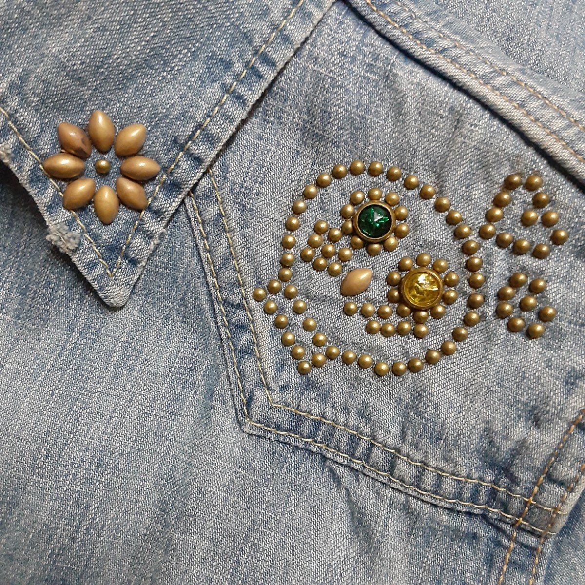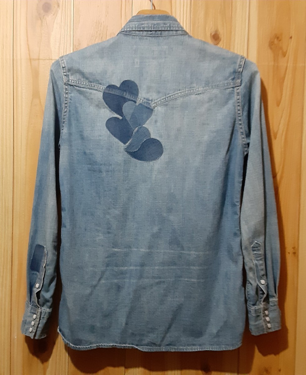 左肩にスカル、左襟にフラワーモチーフのスタッズ装飾、背中にハート型のワッペンをあしらった豪華なデザインです。