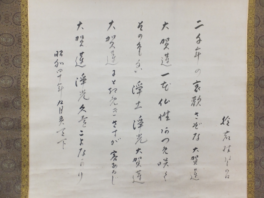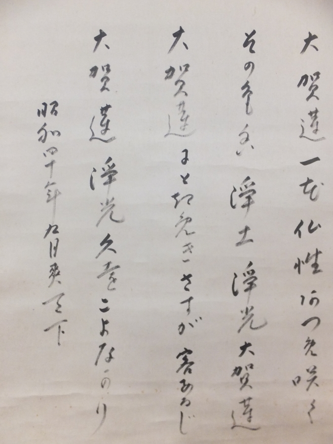 | 説明 | 京都出身 俳人 鈴鹿野風呂の『大賀浄蓮五章』直筆(肉筆) 共箱 御軸です。 状態は、巻オレ・画像に写りきれないシミ等あります。 『昭和四十年九月』とありますので、晩年に書かれた作品です。 コレクターの放出品です、画像で御確認下さい。 ★九州地方の買出し品です。 買出したままでの出品です、御入札宜しくお願い致します。 入札は早めにお願い致します。 一人でも入札があれば梱包作業に入りますので、素早い発送が可能です。 早期終了あり。 鈴鹿野風呂は、(1887-1971) 大正-昭和時代の俳人。 明治20年4月5日生まれ。 京都出身。 京都帝大卒。 本名は登。 「ホトトギス」を通じて高浜虚子に俳句をまなぶ。 大正9年、日野草城らと「京鹿子」創刊、 のち主宰。 旅に関する句がおおく、 句集に「浜木綿」など。 昭和46年3月10日死去 83歳。 |