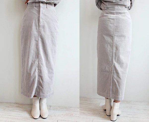ヤヌークのスカート。太畝のコーデュロイ生地を使用しております。ストレッチが効いており、履き心地は快適。バックベント・ロング丈のデザインです。上質な素材使いと綺麗なシルエットで、様々なコーディネートにお使い頂ける一着です。