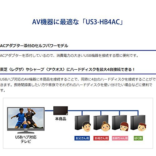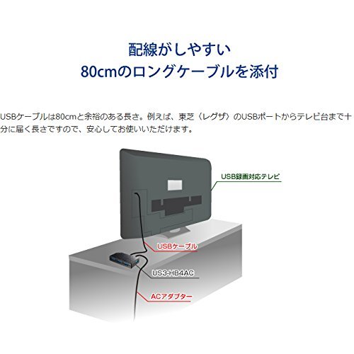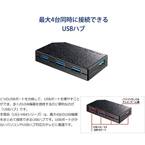 ・ブラック US3-HB4AC・・Style:テレビ用・特長 ハードディスクなどUSB機器を最大4台接続できる! USB 3.0対応USBハブ・対応TV シャープ「アクオス」「ICC PURIOS」、東芝「レグザ」、「レグザチューナーD-TR1」・対応ゲーム機 ソニー「PS3/torne」・接続規格 USB 3.0/2.0・サイズ/重量 約75(W)×45(D)×14(H)mm(突起部、ケーブル分を除く) /約36g(本体のみ)・付属品 USBケーブル(80cm)、ACアダプター、取扱説明書・ 6ヶ月USB 3.0にも対応したUSBハブ 最大4台同時にハードディスクなどUSB機器を接続できます シンプルかつコンパクトなデザインで、置き場所をとりません 最大4台のUSB機器をまとめて接続可能 USBポートが少ないパソコンに最適 ACアダプターが不要なバスパワーモデル