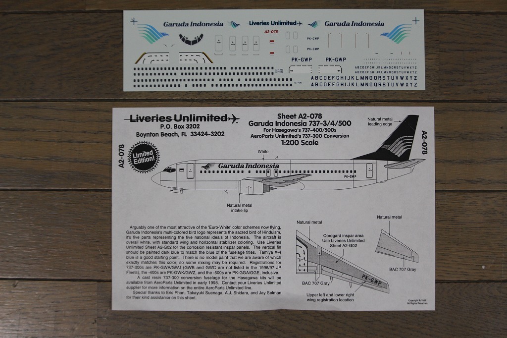 ライブリーズ製1/200ガルーダ・インドネシア航空デカールです。美しい状態です。適合キットの、ハセガワ1/200ボーイング737-400 #51698をお付けします。このキットは、レジン製の旅客機用タラップが付属しています。キットは、中袋未開封です。重量は142g、箱の縦・横・高さの合計は45cm(梱包時60サイズ)です。送料無料です。送付方法は定形外です。プチプチの簡易包装で送ります。京都府大山崎町から発送します。コロナ禍の折、手渡しはいたしません。