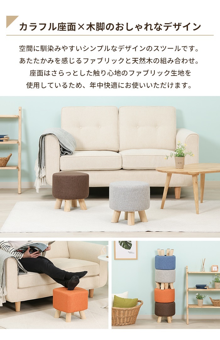 | インテリアのワンポイントにもなるミニサイズのスツール。 カラフル座面×木脚のおしゃれなデザイン。 座面はさらっとした触り心地のファブリックを使用しているので、年中快適にお使いいただけます。 空間に馴染みやすいシンプルなデザインとカラー展開。 さまざまな場所で活躍するミニスツールです。 |