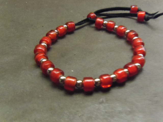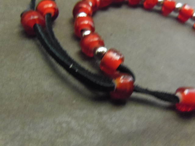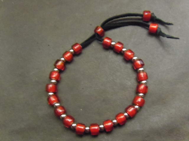 高級鹿革ひも(黒)、ホワイトハーツビーズ STビーズ(ステンレス)を組み合わせたブレスレットです。
