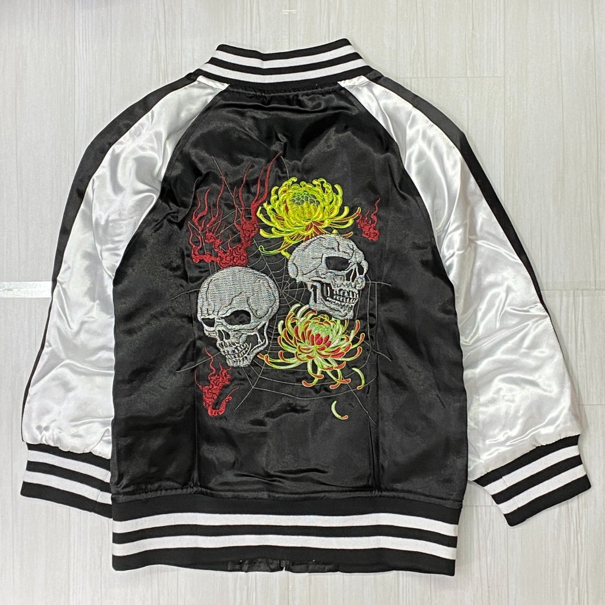 横須賀発祥 スカジャン 【160】 キッズ SUKAJAN 総刺繍 SKULL スカル ドクロ 黒 中綿入り サテン地 キルティング 和柄 冬仕様 ロック