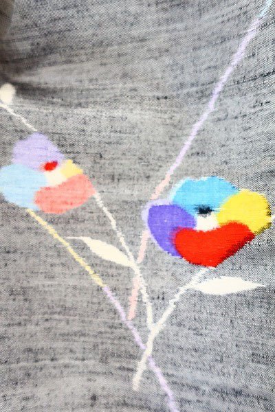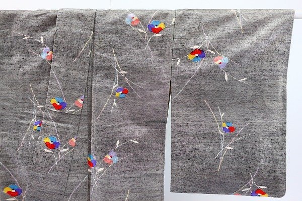 灰地に椿が描かれた可愛らしい紬です。 椿の花びらが、赤、黄、水色、青とカラフルに描かれておりとてもお洒落です。 紬独特の素朴で温かみのある風合いが特徴です。 担当:石井 |