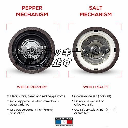 PatternName:ソルト 12cmStyle:単品・サイズ:5.5×5.5×12cm・ 本体重量:0.15kg・ 素材・材質:本体/木(ブナ材)、グラインダー・シャフト/ステンレススチール・ 生産国:フランス・ 適正容量:ソルト28gサイズ:120mm