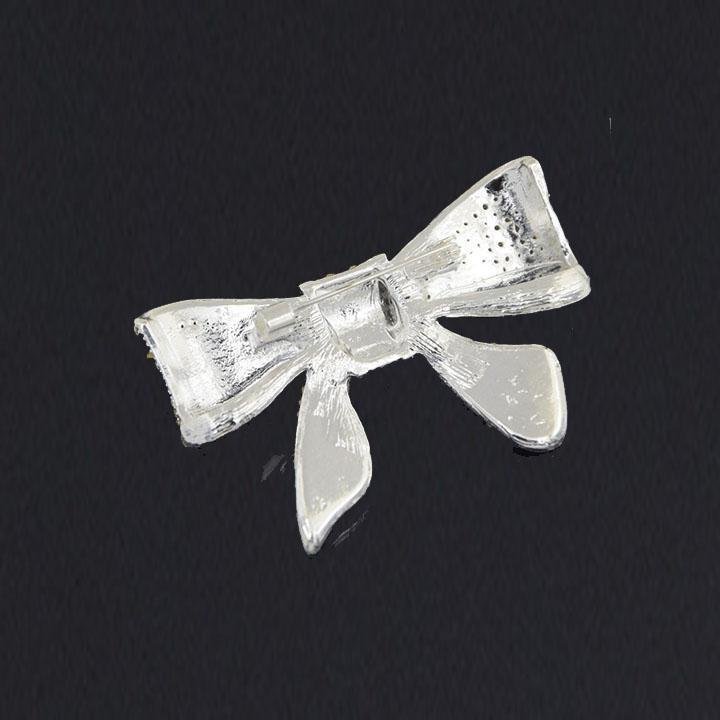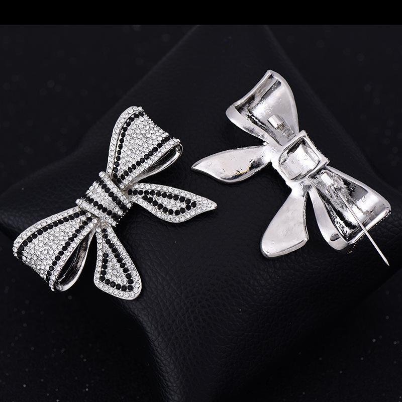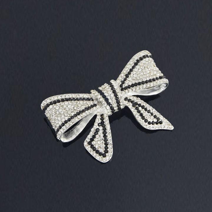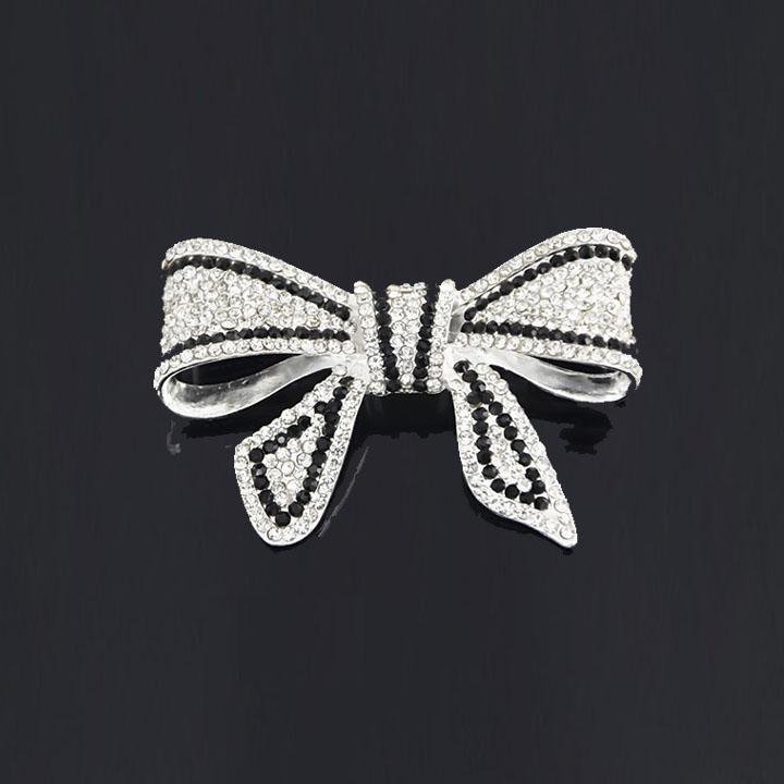 高級 黒白 リボン キラキラ スカーフ留め ブローチ/シルバー
