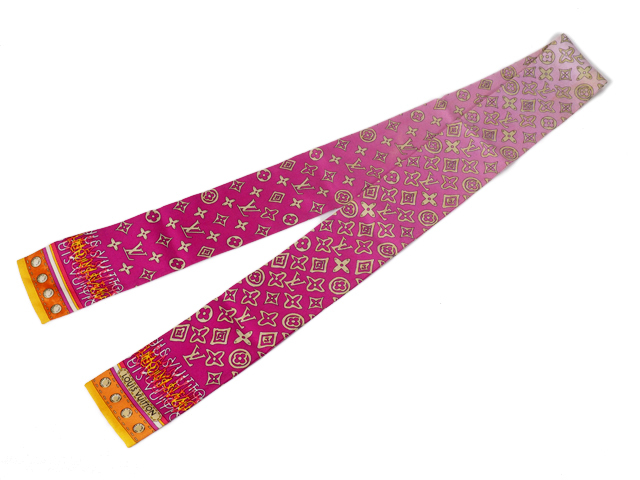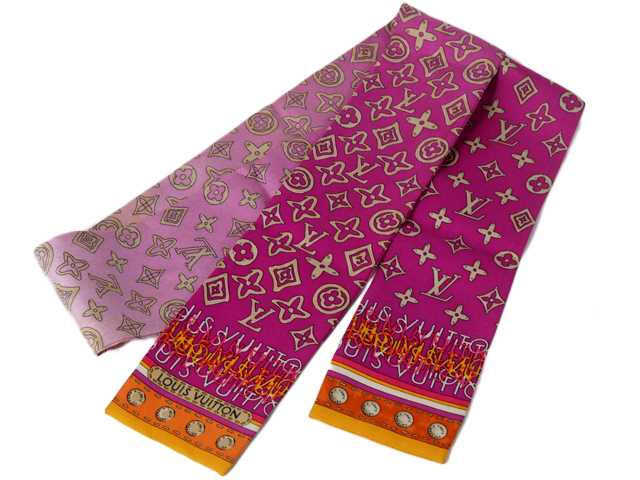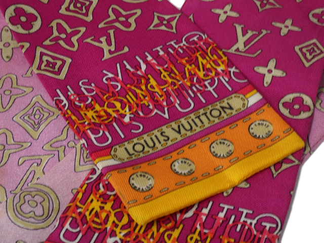 富士屋 ◆ ルイヴィトン LOUIS VUITTON バンドー・モノグラム マップ リボンスカーフ M74569 オレンジ パープル