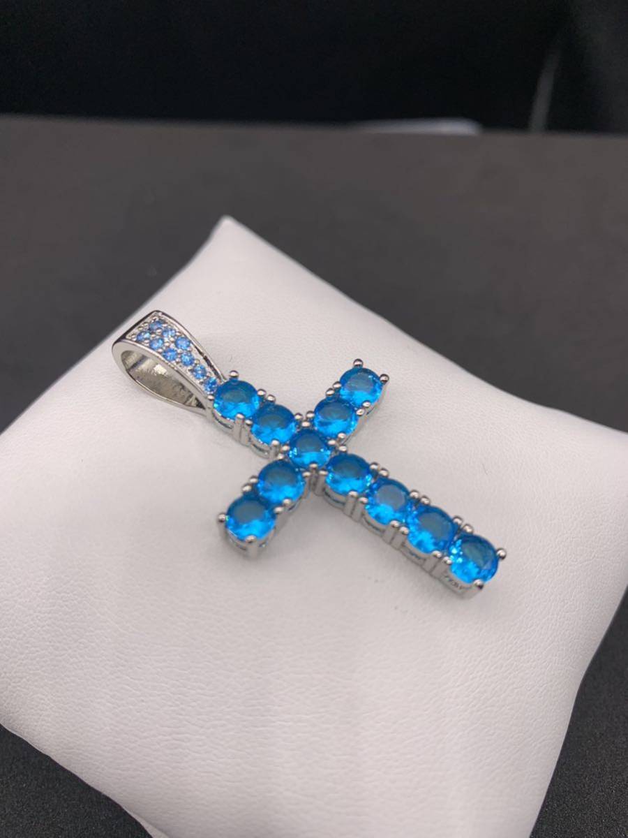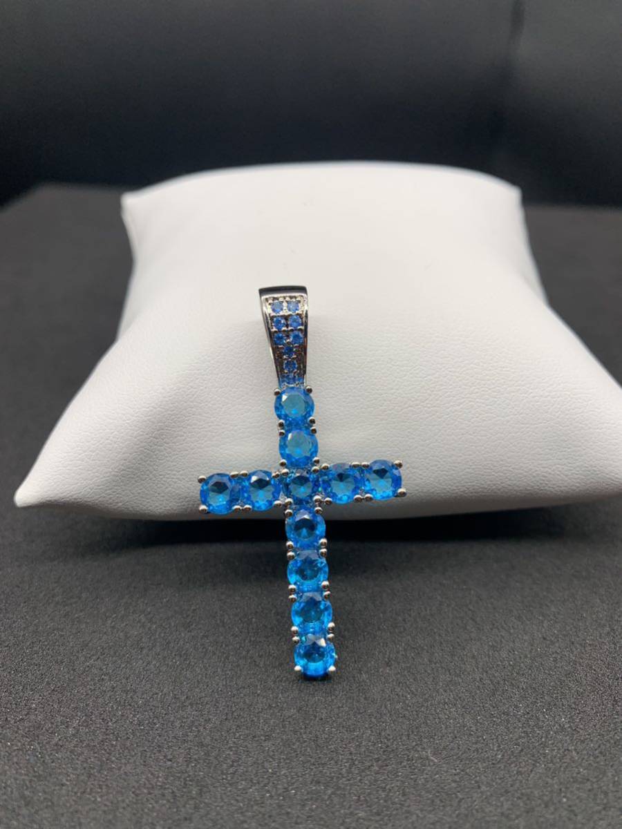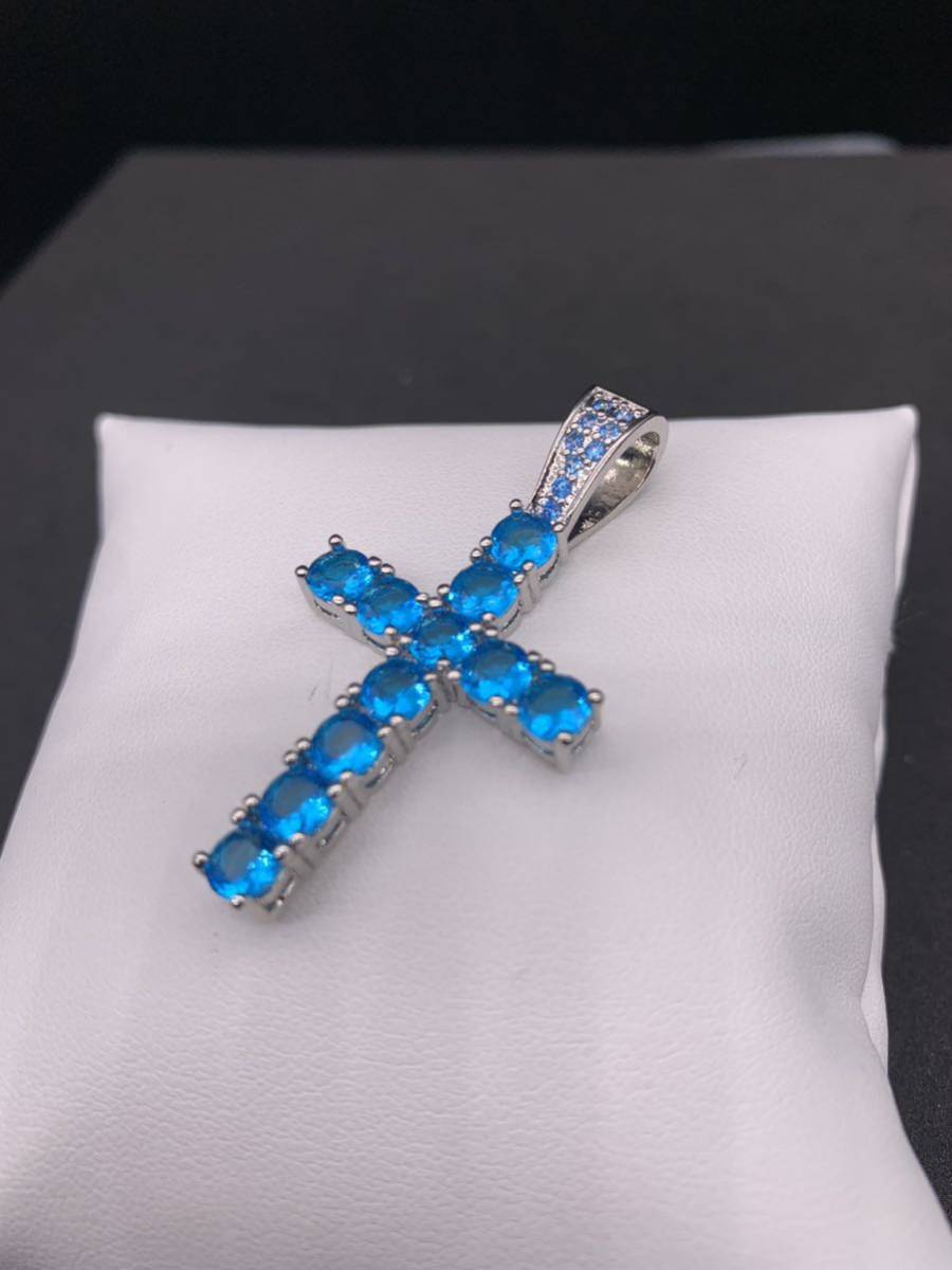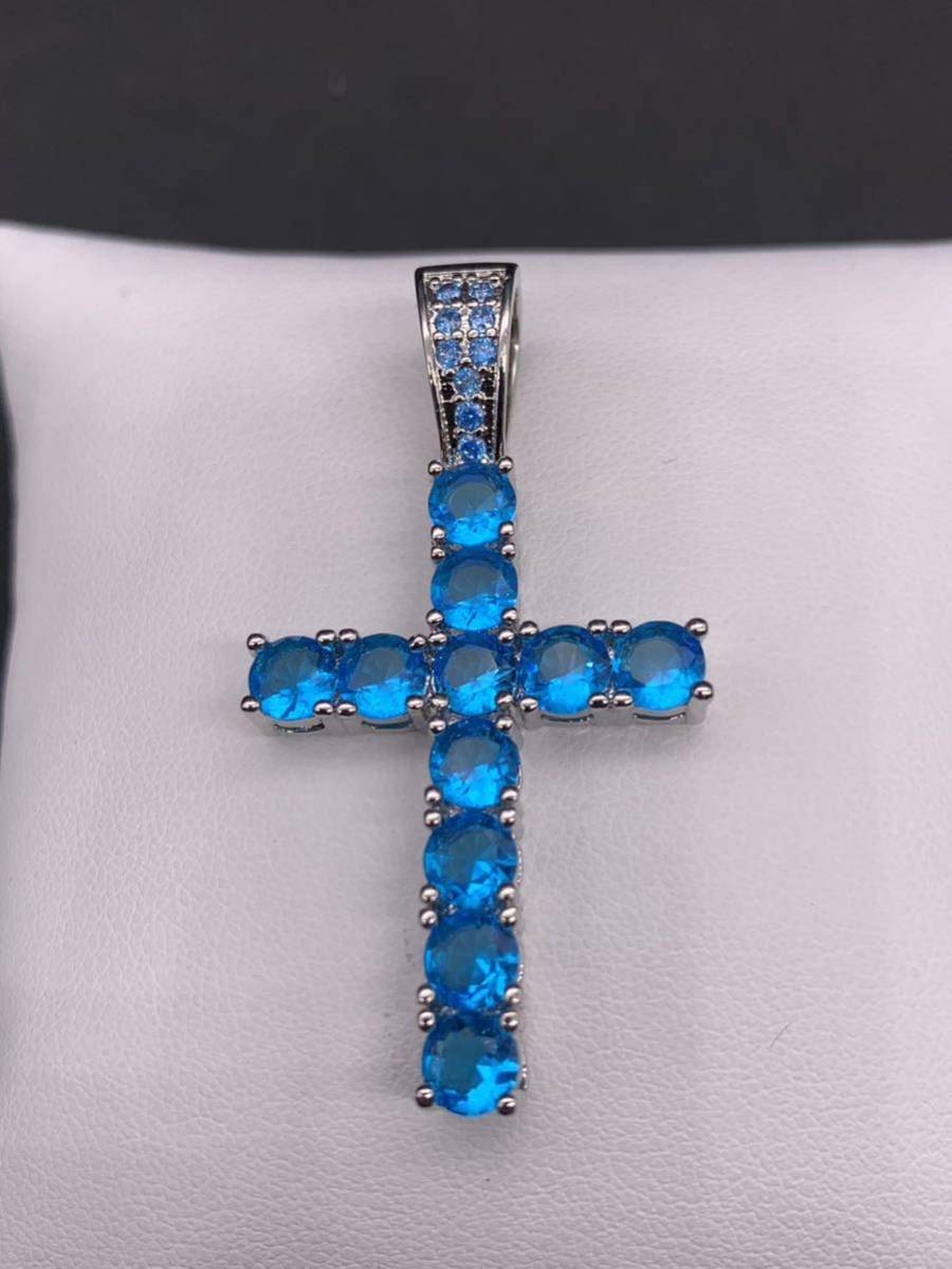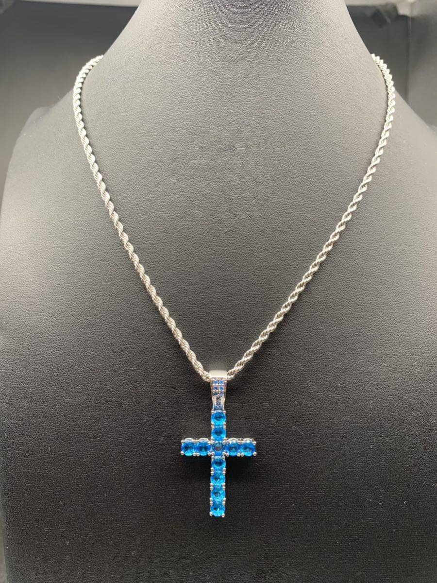 スカイブルーの大粒ジルコニアがキラキラと輝く、お洒落なロザリオ デザインのネックレスです。