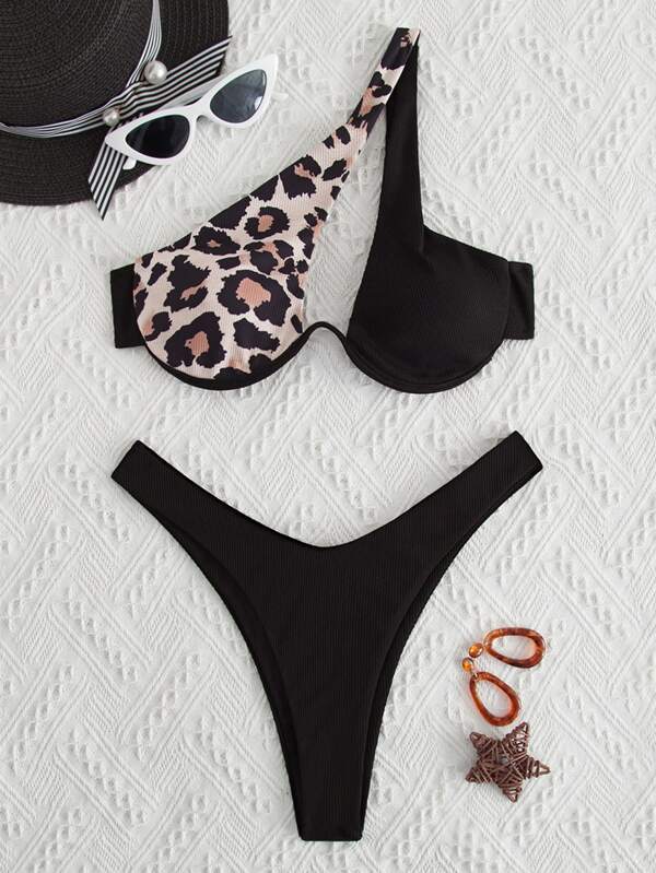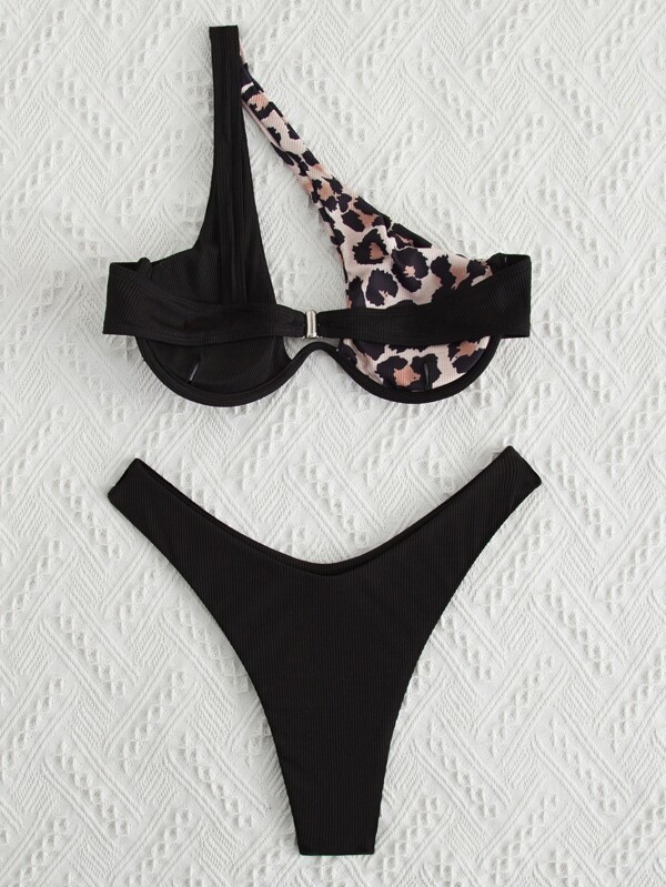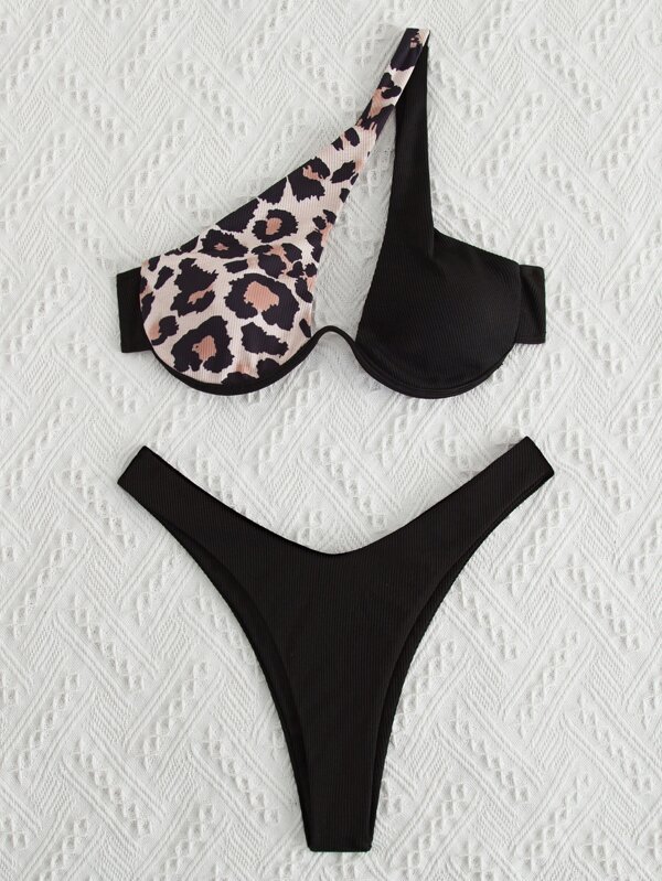 レディース 水着 ビキニセット ヒョウ柄 リブ ビキニセット カットアウト アンダーワイヤー ワンショルダー ブラジャー & ハイ