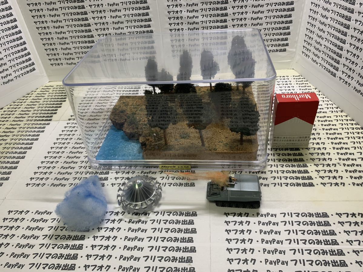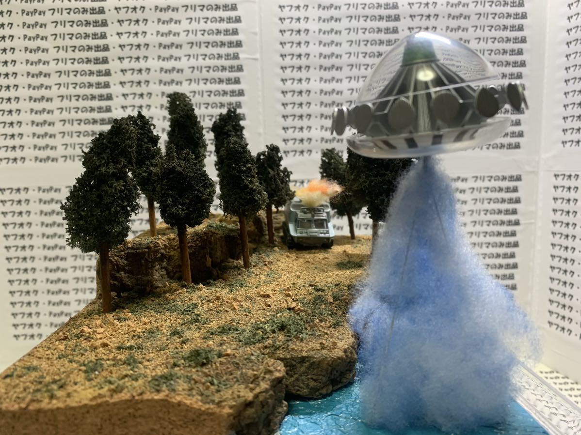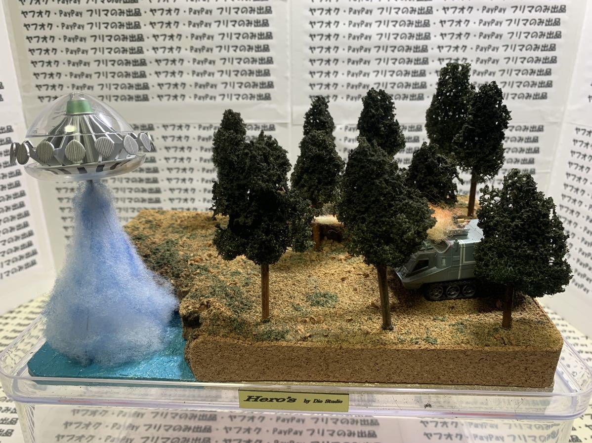 ★送料無料★ジオラマ 謎の円盤UFO 「邀撃」★模型作りが高じて、コナミ のSFムービーセレクション UFOとシャドーモービルを使って、湖底から離水したUFOをシャドーモービルで邀撃するシーンを表現しました。★シャドーモービルにロケット砲を取付けてみました。★UFOの底面穴に、水煙の支柱先端を差込んで飛行状態にします。★ジオラマは、幅約28㎝、奥行19㎝、高さ14.5センチのプラスチックケースを使用し、重量612gになります。★私の作風をインスタグラムhttps://www.instagram.com/diostudio3にアップしていますので、お楽しみください。★