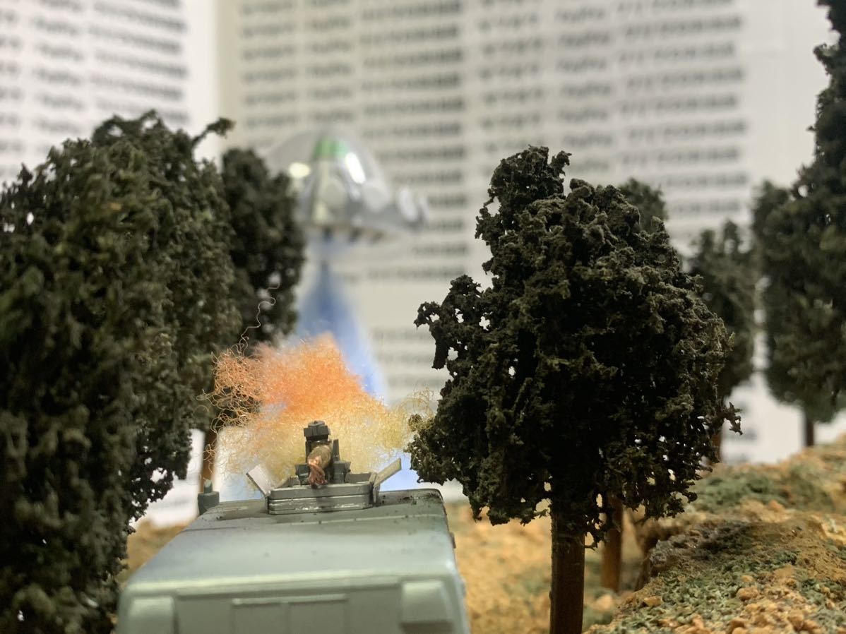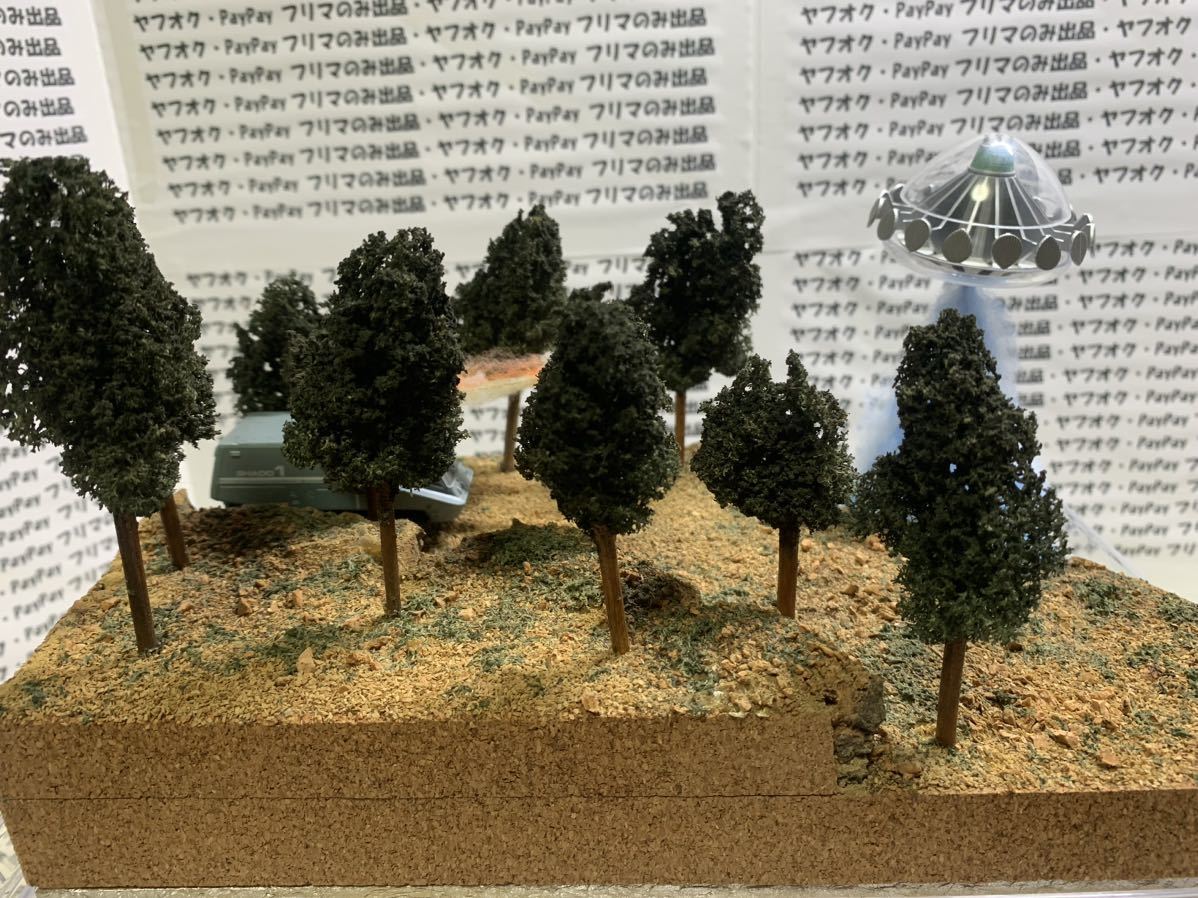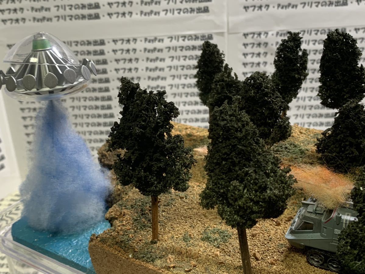★送料無料★ジオラマ 謎の円盤UFO 「邀撃」★模型作りが高じて、コナミ のSFムービーセレクション UFOとシャドーモービルを使って、湖底から離水したUFOをシャドーモービルで邀撃するシーンを表現しました。★シャドーモービルにロケット砲を取付けてみました。★UFOの底面穴に、水煙の支柱先端を差込んで飛行状態にします。★ジオラマは、幅約28㎝、奥行19㎝、高さ14.5センチのプラスチックケースを使用し、重量612gになります。★私の作風をインスタグラムhttps://www.instagram.com/diostudio3にアップしていますので、お楽しみください。★