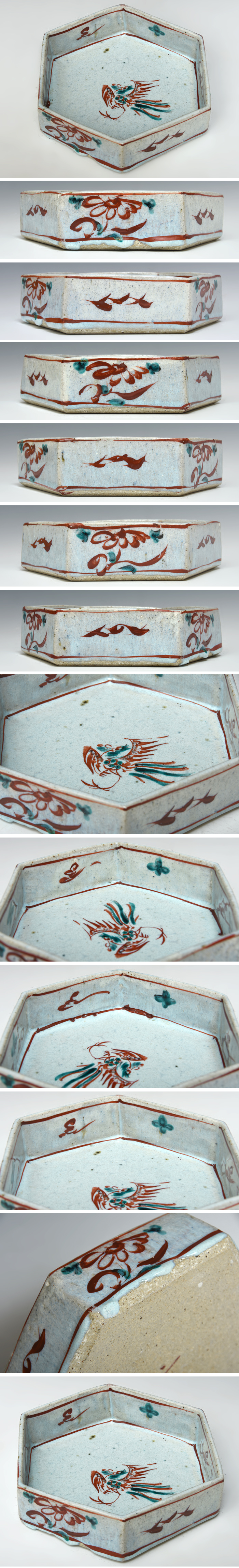 六角の亀甲型の鉢に坪島土平が見込みに鳳凰図、縁に花文様を赤絵で描いております。 高台に廣永の丸印と土平のサインが朱で描かれております。 未使用でキズ等なく良い状態です。 ※撮影の際に生じた写り込みなどがございます。 ご理解の程よろしくお願い致します。 |
