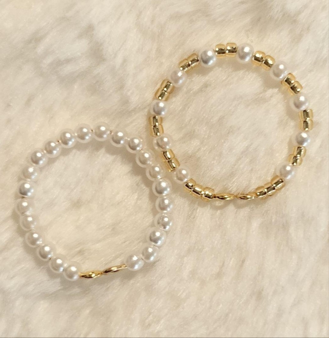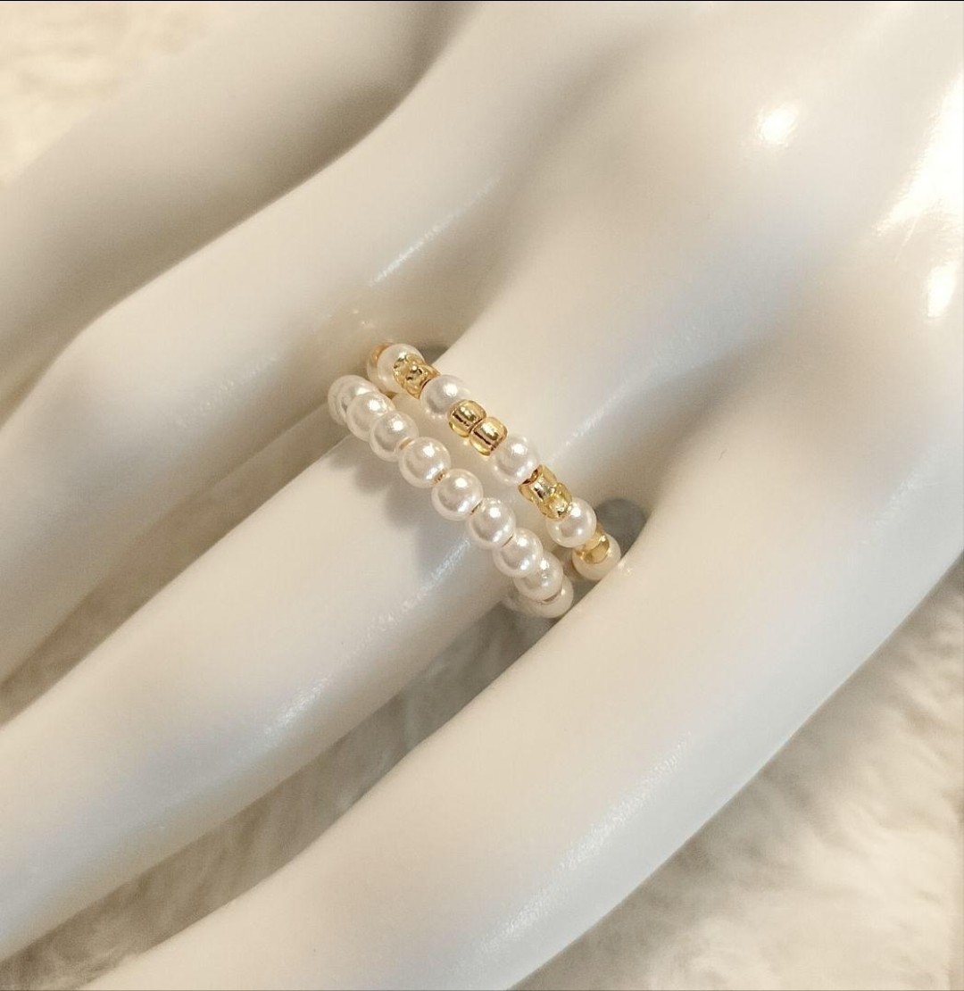 3㎜のアクリルパールビーズと、内側コーティングの変色しにくいゴールドビーズを組み合わせたリングの2本セットでございます。