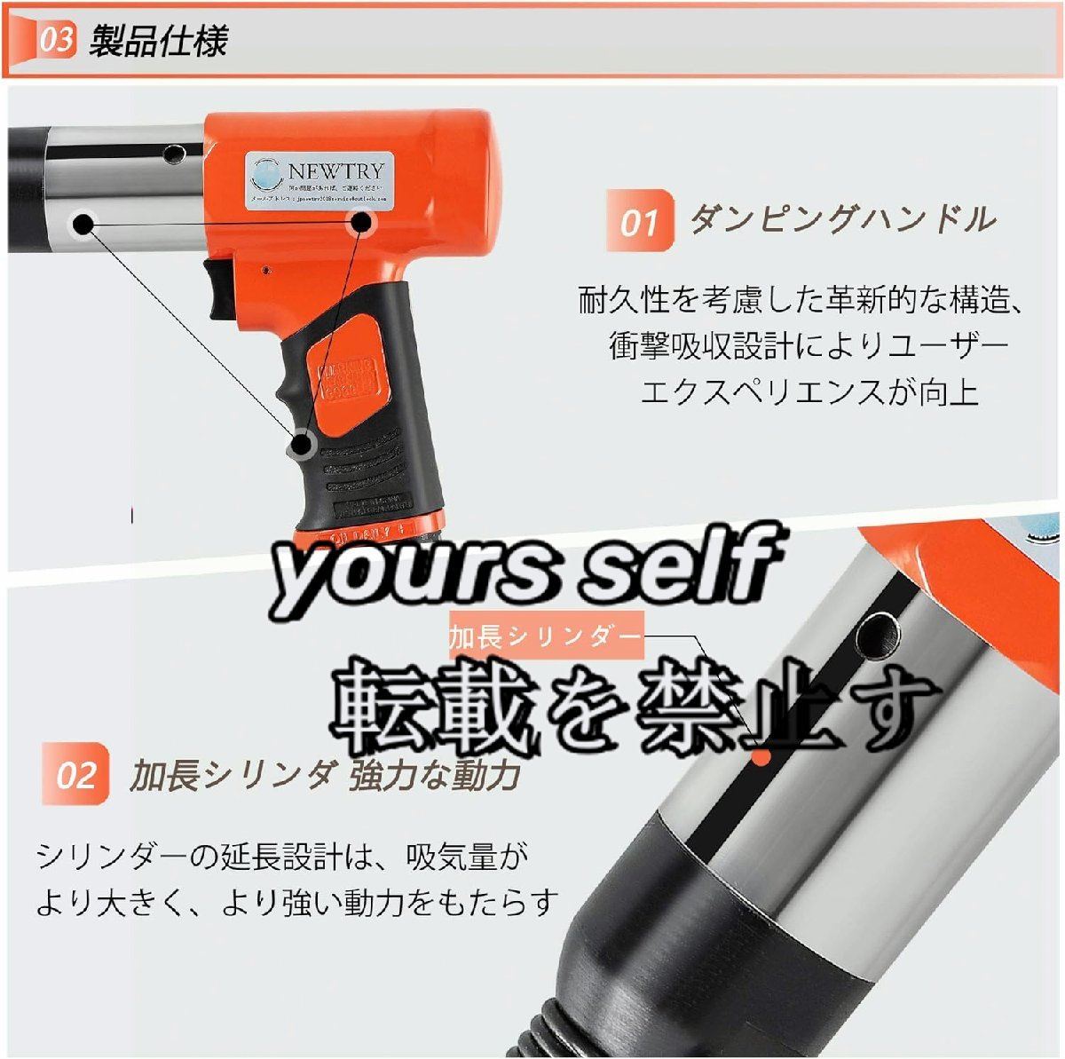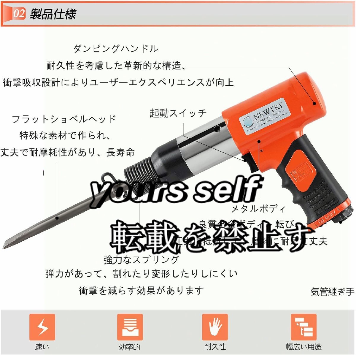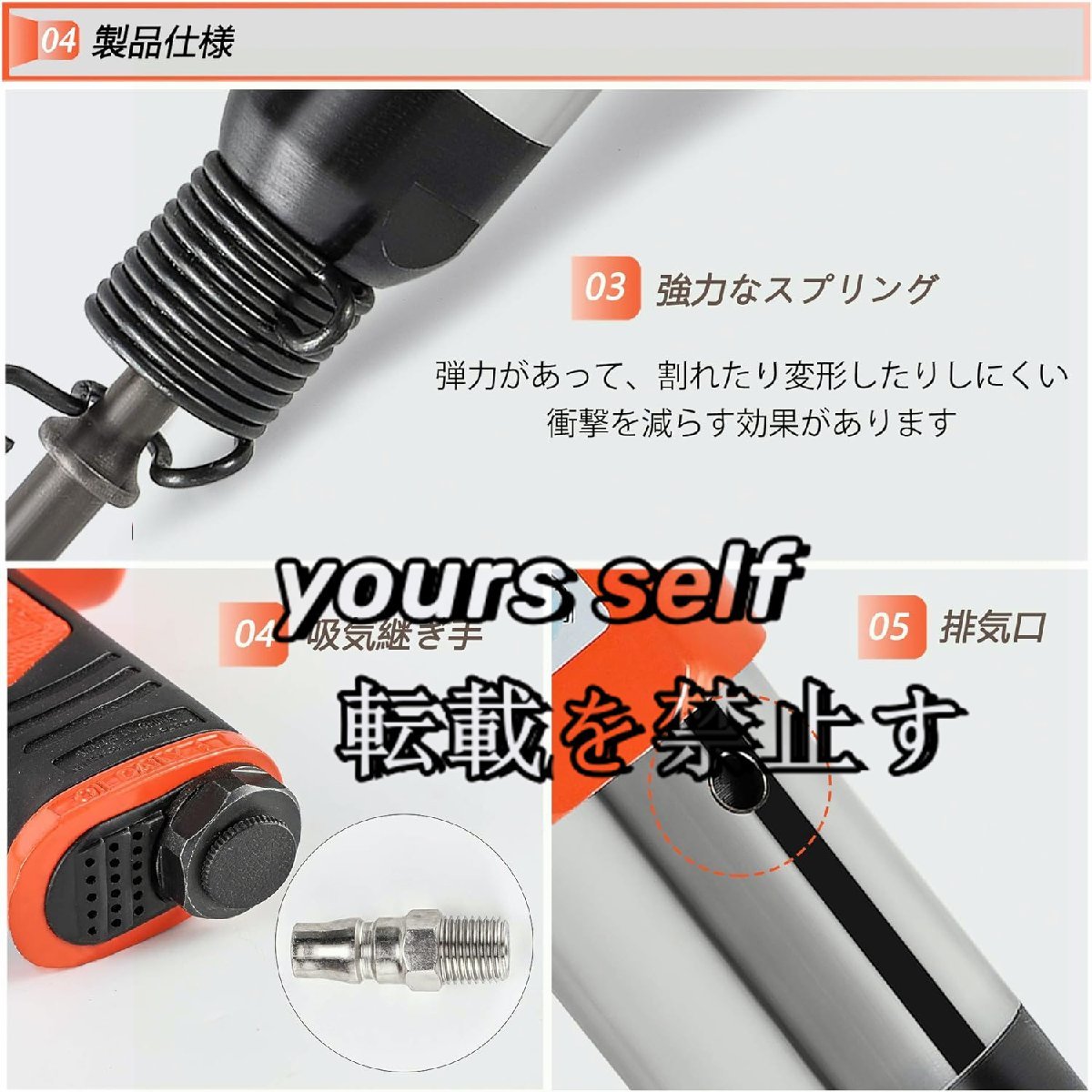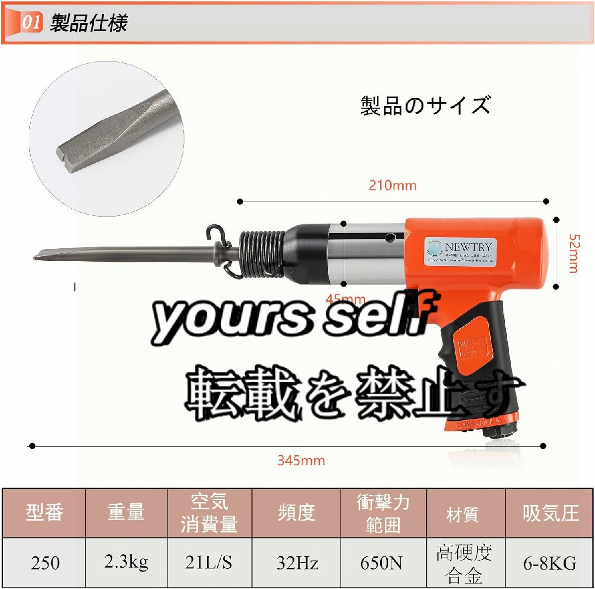 【仕様】材質:高硬度合金 重量:2.3KG 衝撃力範囲:650N 空気消費量:21L/S min、吸気圧:6-8KG
