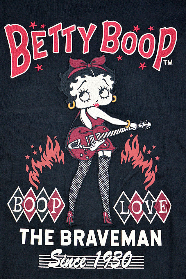 1920年代~40年代にアメリカでワークウェアを中心とした製品を世に送り出したブランド「The BRAVE-MAN」から「BR×BETTYコラボ 天竺ロングTシャツ(BBB-2401)」のご紹介です。 大きな瞳とぽってりした赤い唇が印象的な女の子、ベティ・ブープ(Betty Boop)。 背中にはキュートな衣装に身を包んだギタリストのベティが刺繍で落とし込まれています。 ボディーには、ややしっかりとした刺繍に負けない強さを持ったTシャツ生地を採用。 カジュアルに着こなしに取り入れることの出来る、大人のキャラクターアイテムです。 | |||||||||||||||||||||||||