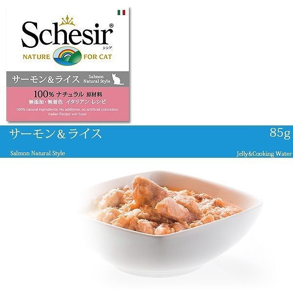 シシア キャットシリーズ ゼリー&クッキングウォータータイプ「サーモン&ライス」消化しやすく、水分も摂りやすい。 ビタミンやミネラルを多く含んだ栄養価の高いウエットフード。サーモンは強い抗酸化力のアスタキサンチンやDHA・EPAを持つ魚です。ライスはビタミンB1を含有し糖質の代謝を助けます。ビタミンEは抗酸化効果があり、食物繊維は消化を促進します。【原材料】サーモン70%、米1.2%、ビタミンA1325IU、ビタミンD3110IU、ビタミンE15mg、タウリン160mg【成分】粗タンパク質14%、粗脂肪1.5%、粗繊維0.1%、粗灰分1.5%、水分82%【カロリー】65kcal/100g
