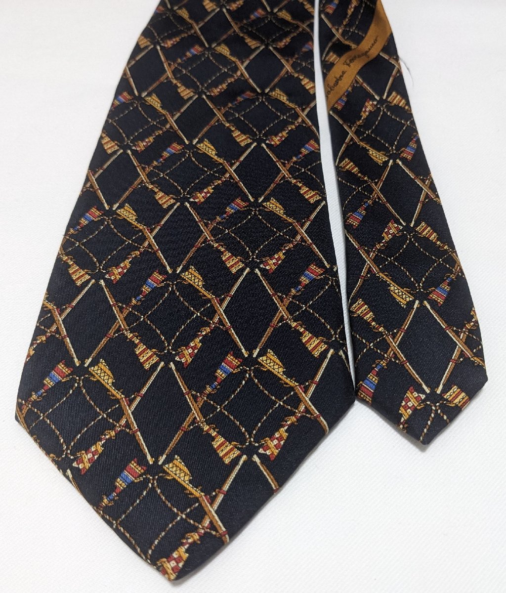 ■フェラガモ ネクタイ 絹100% 紺 チェック 落札当日同梱可能 ¥300で3本まで同梱可能 Salvatore Ferragamo A■