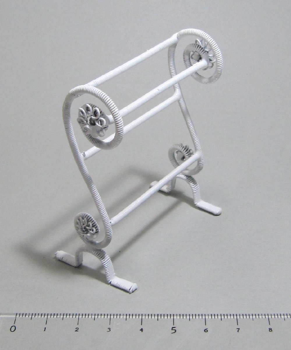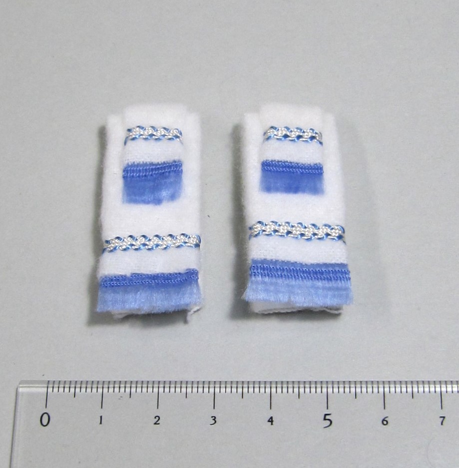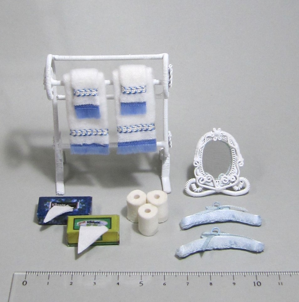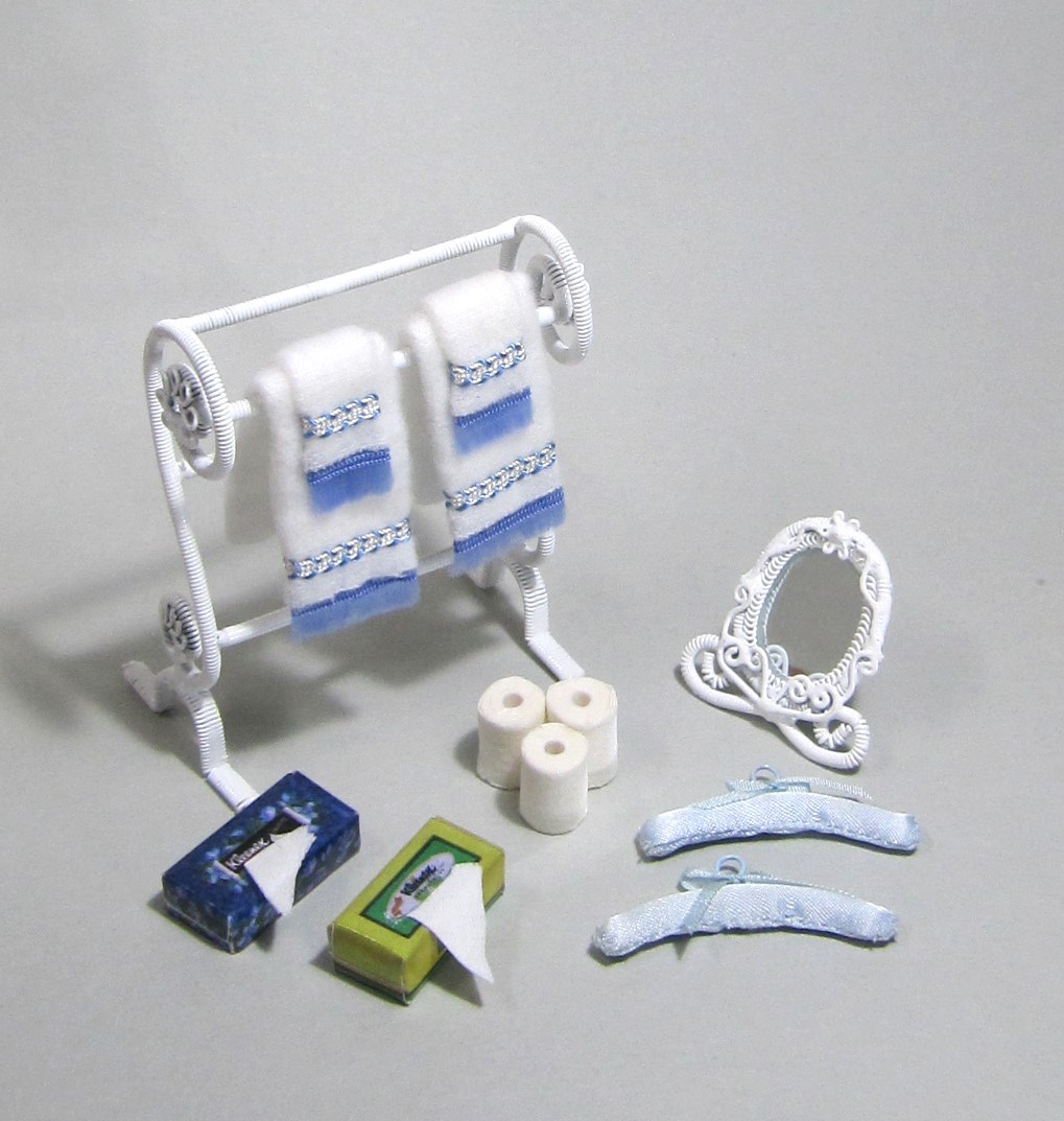 12分の1ドールハウスサイズ、ミニチュアタオルラックと小物セット。タオルラック、サイズ高さ約7cm。金属製、中国製。鏡1点、中国製。フリンジ付きタオル2枚。アメリカ製(裏側は切りっぱなしです)ティッシュの箱2点、タイ製。トイレットペーパー3点、タイ製。ブルーのハンガー2点、タイ製。サイズは写真でご確認ください。