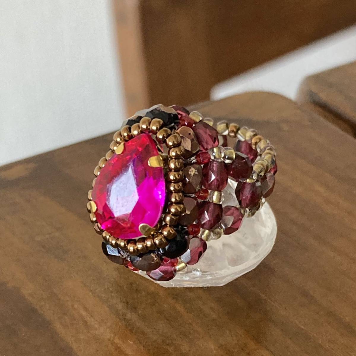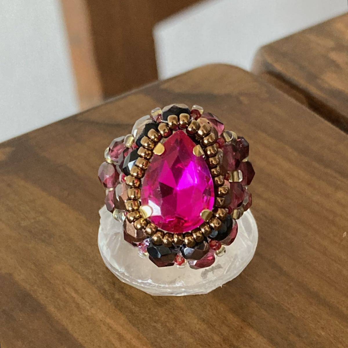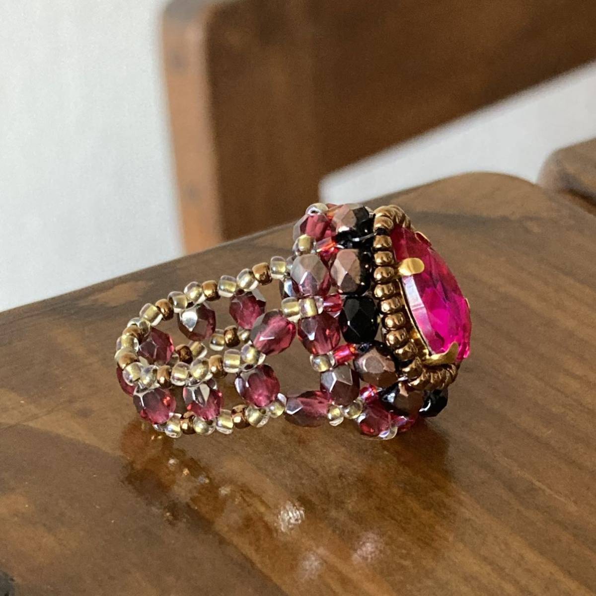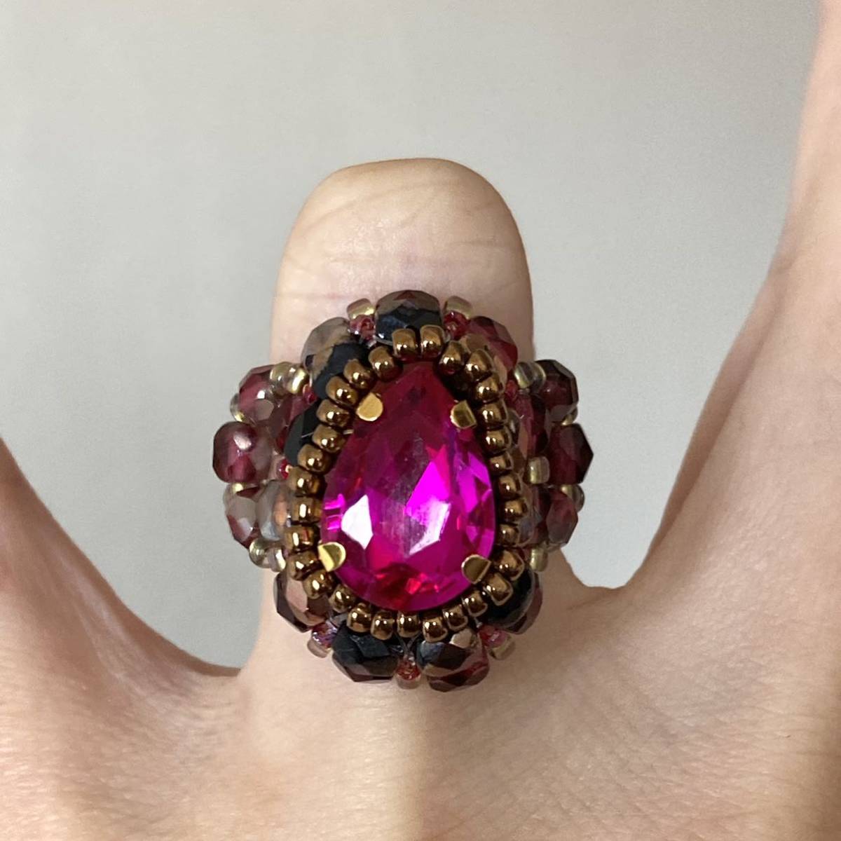 14mmの濃いピンクのドロップ型ガラスラインストーン、4mmの黒に半分ブロンズ加工、濃いピンク系のチェコビーズ、ブロンズ、ピンク、クリアゴールド系の丸小ビーズで作ったリングです。