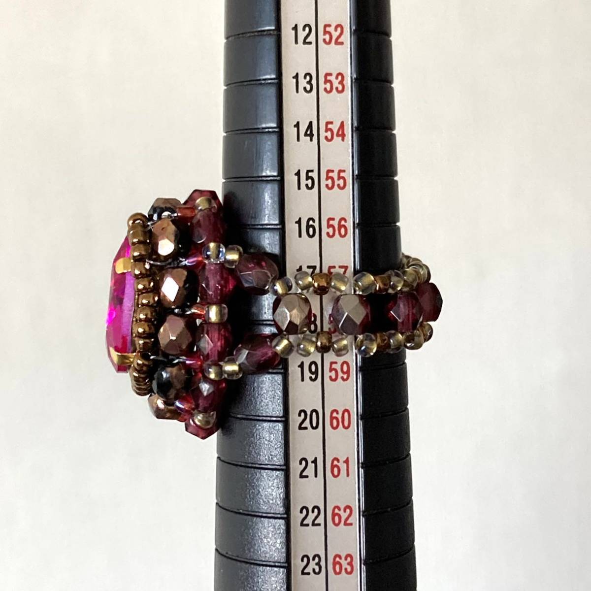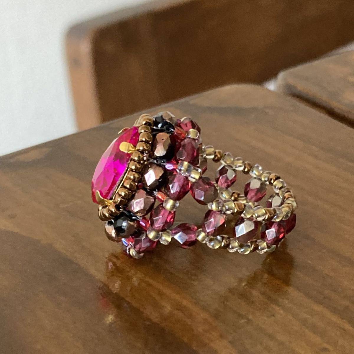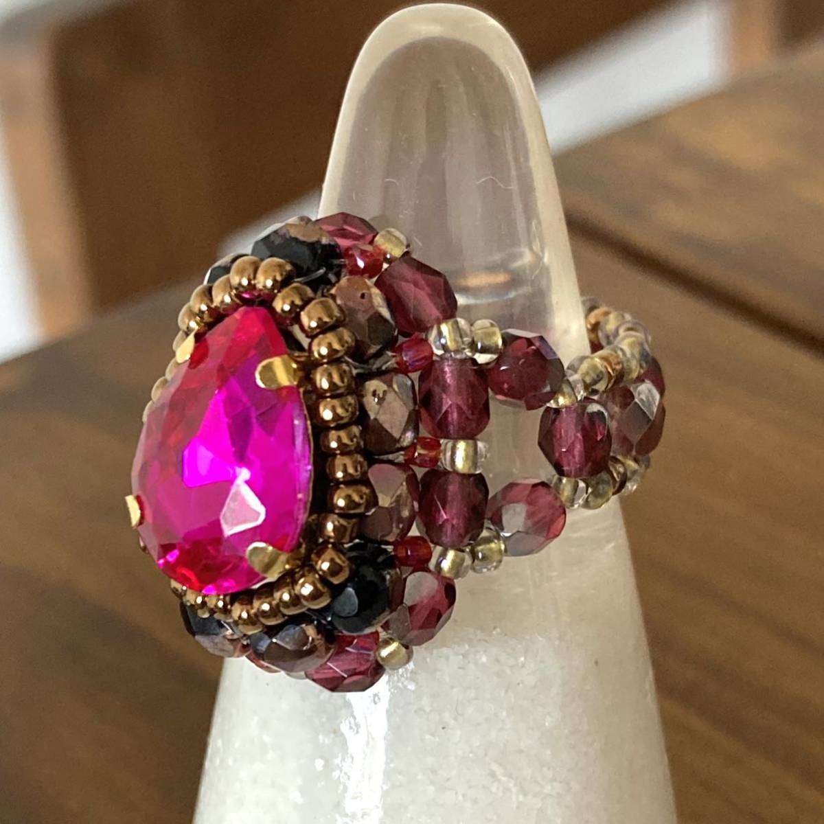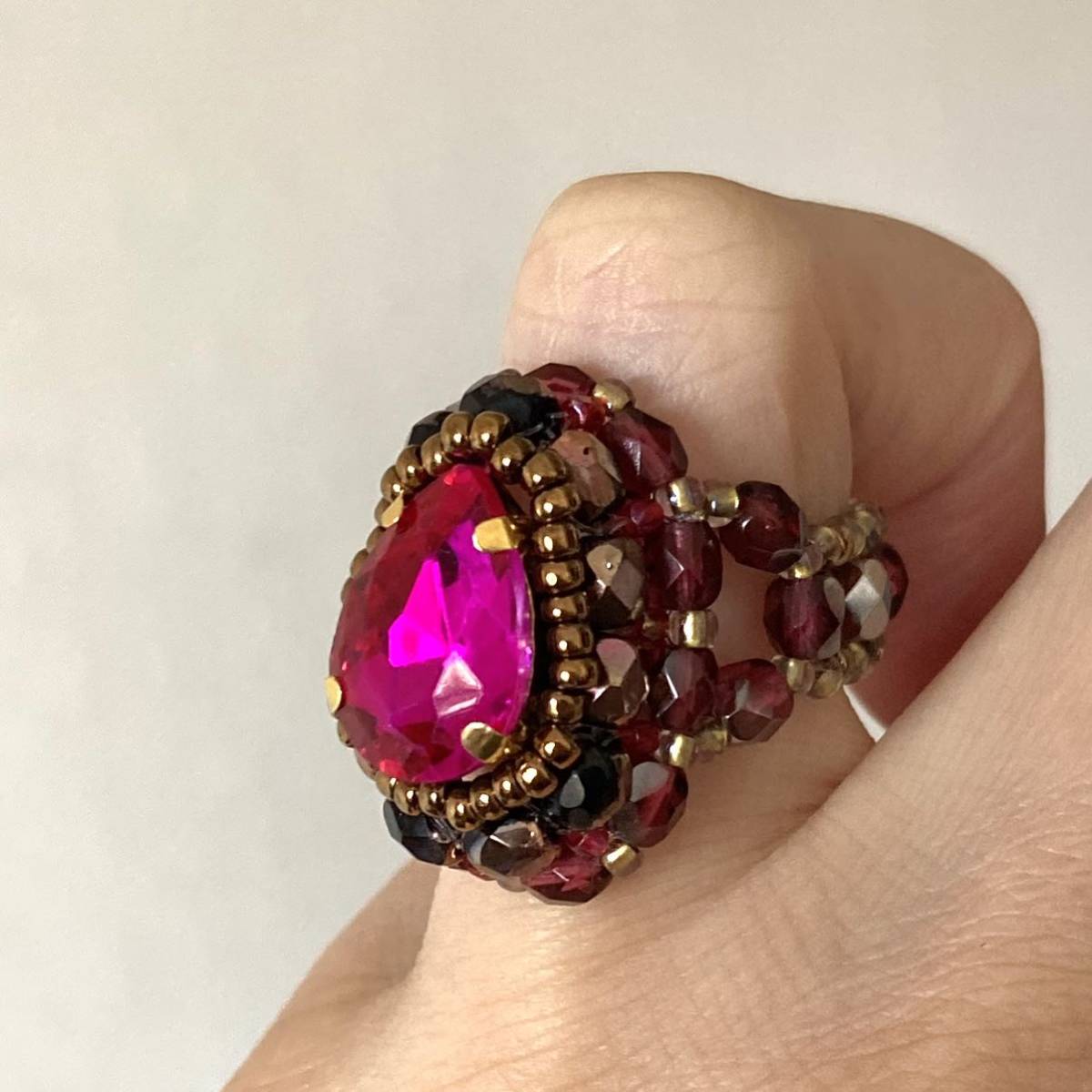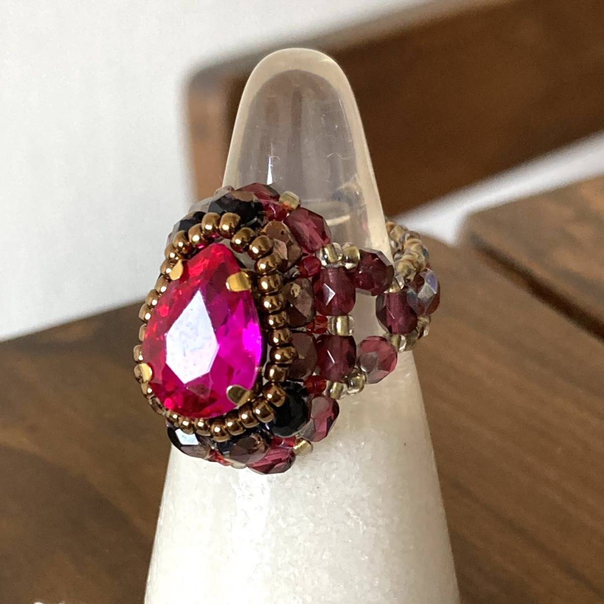 14mmの濃いピンクのドロップ型ガラスラインストーン、4mmの黒に半分ブロンズ加工、濃いピンク系のチェコビーズ、ブロンズ、ピンク、クリアゴールド系の丸小ビーズで作ったリングです。