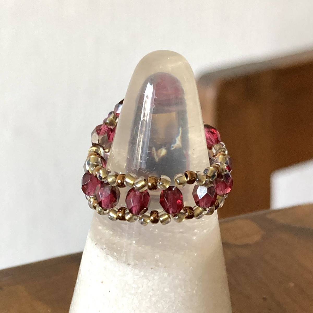 ラインストーンの周りをチェコビーズと丸小ビーズで3重に編んだデザインのリングです♪