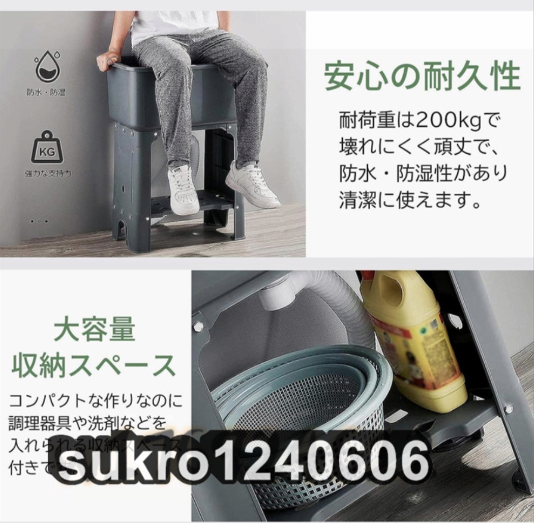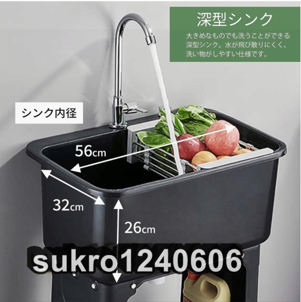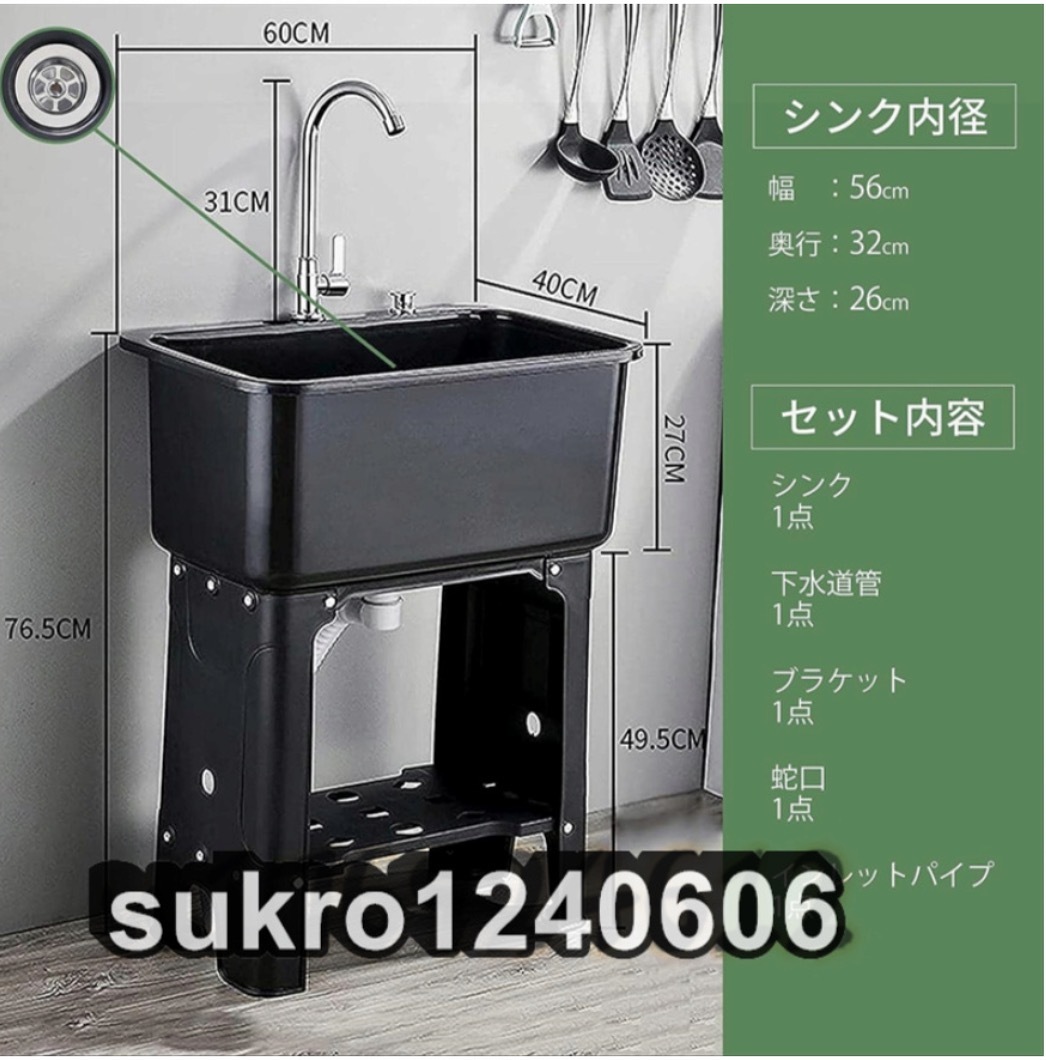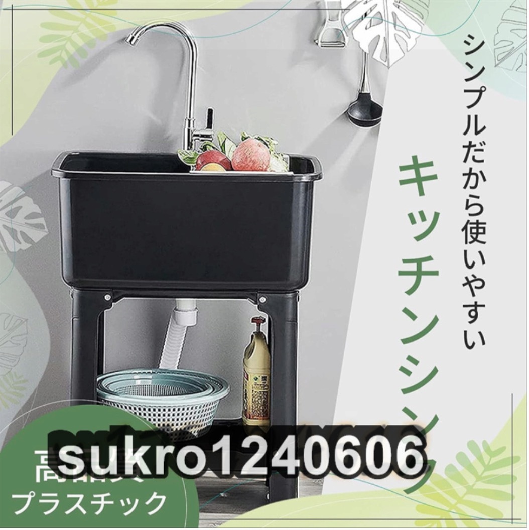 【高品質でシンプルなキッチンシンク】流し台は高品質のプレミアムプラスチックでできており、耐摩耗性、耐日射性、耐落下性があり、お手入れも簡単です。 安定したスタンドのため、耐荷重は約200kg。頑丈で壊れにくく、防水性と防湿性もあります。場所を取らないコンパクトなサイズなのに、嬉しい大容量収納スペース付き。 【使いやすい深型シンク】大きめなものでも洗うことができる深型シンク。洗い物の際にまわりに水が飛び散りにくいので、キッチン以外で使用する場合は、靴など洗面所や台所では土汚れが気になって洗いにくいものも気兼ねなく洗うことができます。蛇口は360度回転するので、お手入れも簡単です。 【防水・防湿性と防臭パイプで清潔】防水性や防湿性がある為、清潔にお使いいただけます。排水パイプは防臭性があり虫を寄せ付けず、大口径なので排水が速く便利です。 【組み立て簡単】組み立て式の簡易型流し台のため、簡単に組み立てることができます。高さは約76.5cm。作業してても腰が痛くならない程よい高さです。 【利用シーン】キッチン、ガーデン、バー、レストラン、クリーニング店、オフィス、喫茶店、ガレージやその他の商業施設など様々な場所でお使いいただけます。