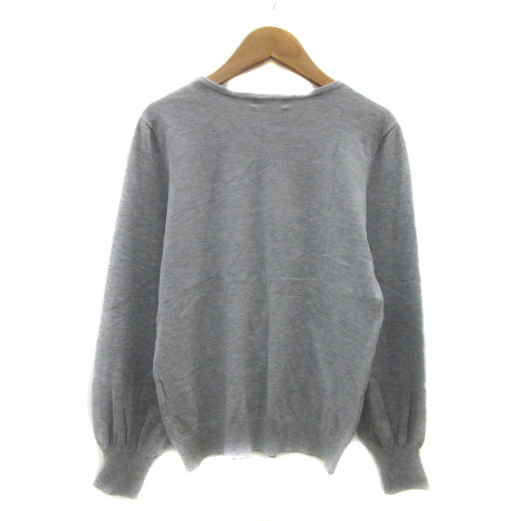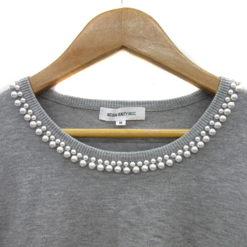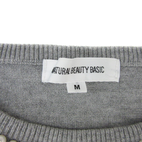 ナチュラルビューティーベーシック ニット カットソー 長袖 ラウンドネック 無地 ビジュー フェイクパール M グレー レディース